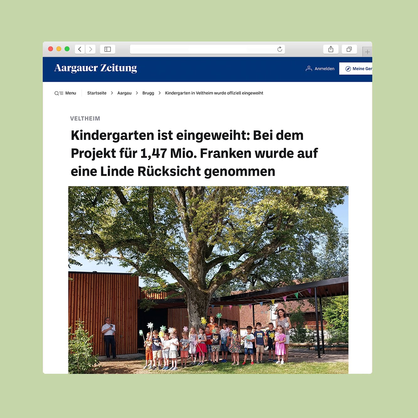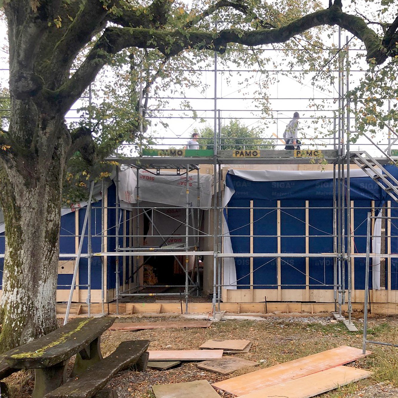 Die Holzbauelemente unseres Kindergartenprojektes in Veltheim fügen sich unter dem grossen Blätterdach langsam zum fertigen Haus. Das Volumen umspielt die mächtige Linde und überbrückt deren Wurzeln mit einer massgefertigten Fundation.