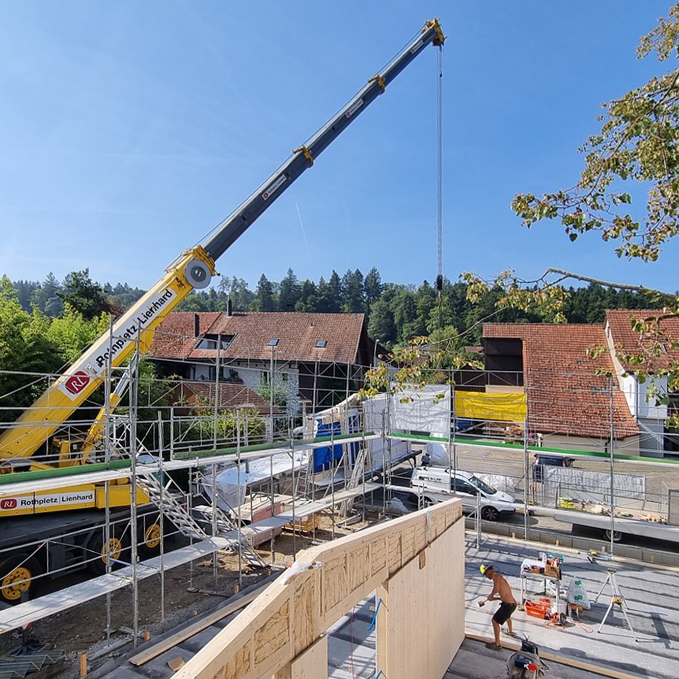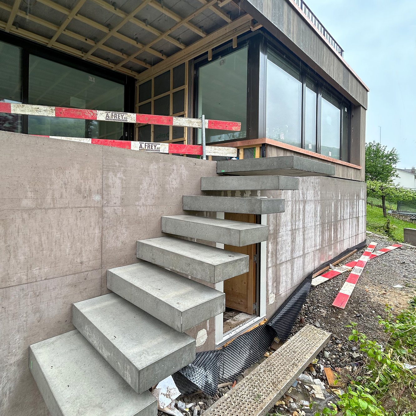 Unser Einfamilienhaus in Wittnau ist bereits weit fortgeschritten und der Holzbau war nach kurzer Bauzeit erstellt. Nun laufen die letzten Arbeiten im Schlussspurt des Projekts, bis es bald der Bauherrschaft übergeben werden kann.