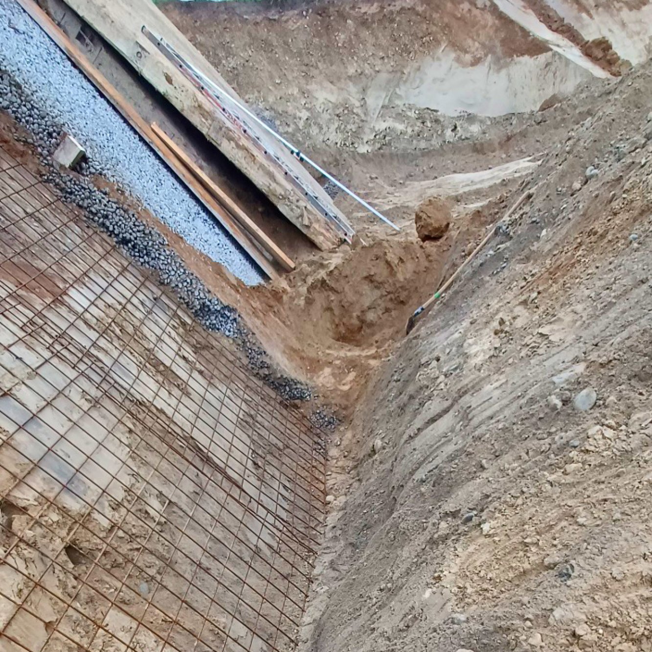 Die ersten Bagger sind aufgefahren und haben mit den Aushubarbeiten und Hangsicherungen begonnen. Bald schon darf hier unser Holzhaus aus dem Boden wachsen...