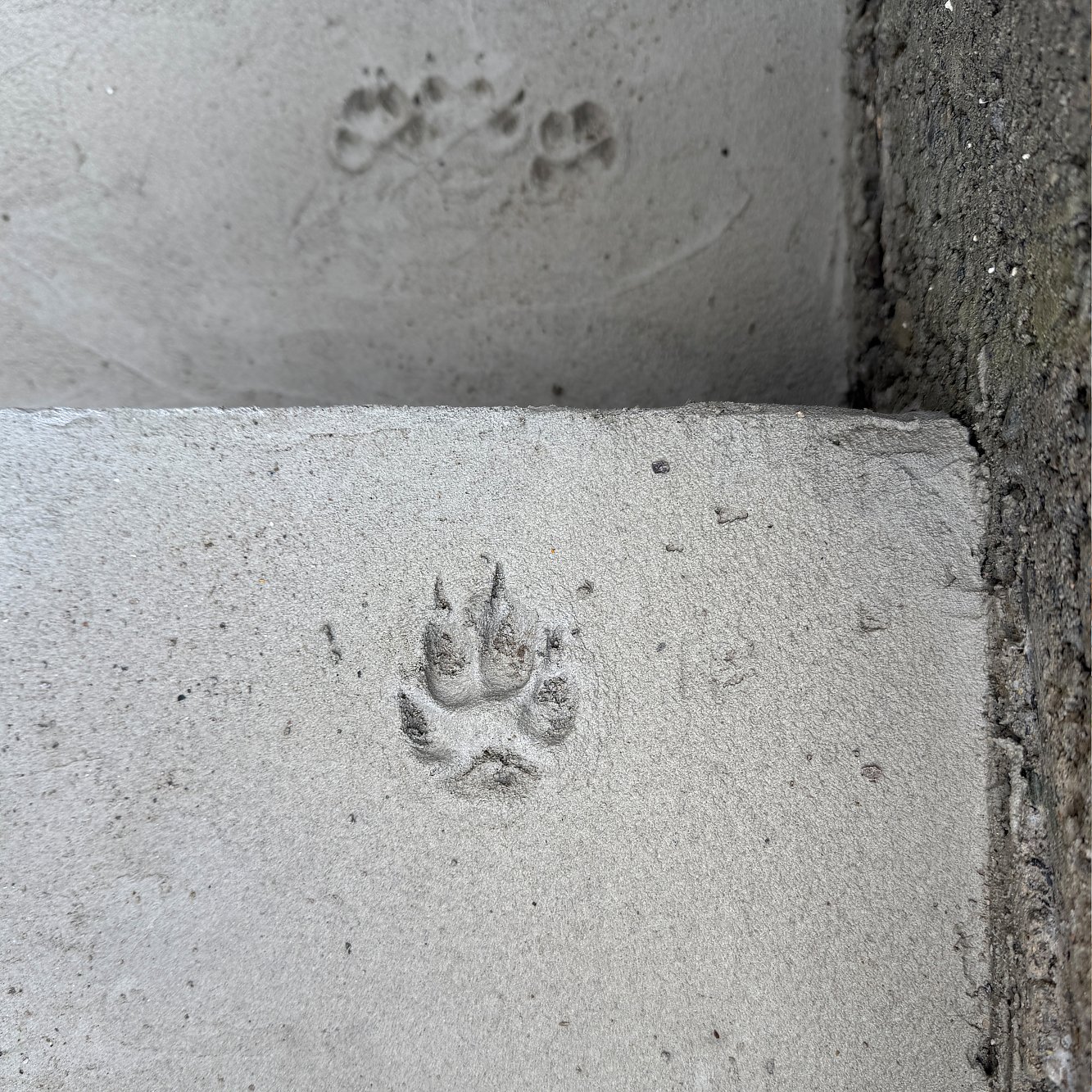 Im frischen Beton der Gartentreppe haben letzte Nacht gleich mehrere, tierische Dorfbewohner ihre Spuren hinterlassen. Unsere Bauleiter werden zu Hobbyzoologen und tippen auf Luchs und mindestens ein Büsi...
