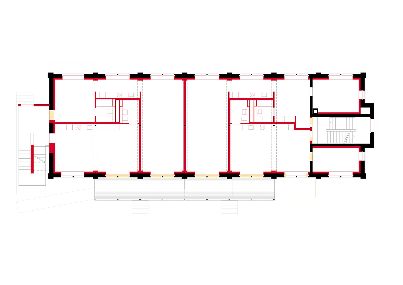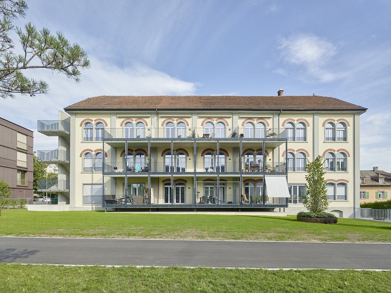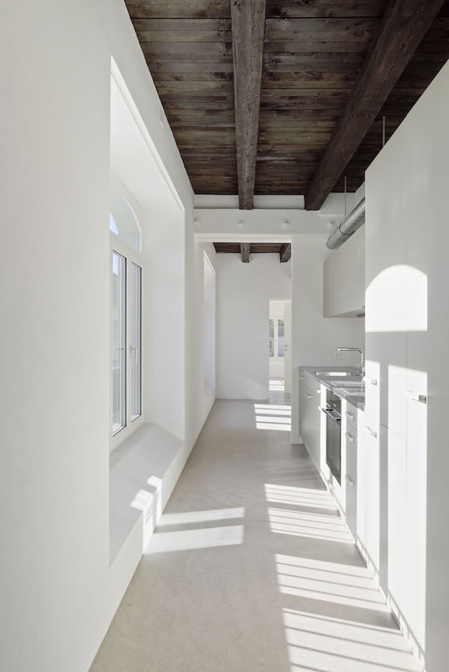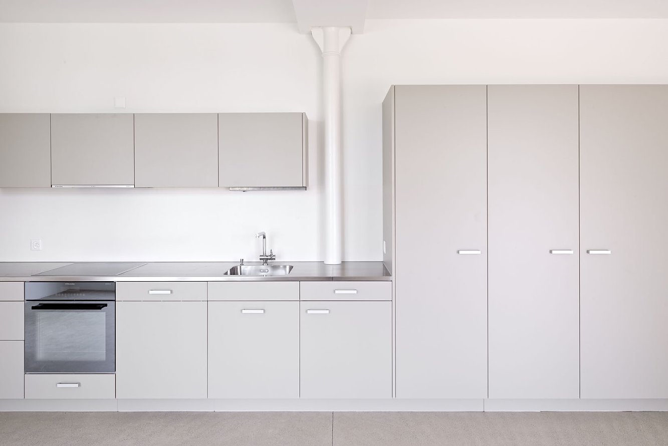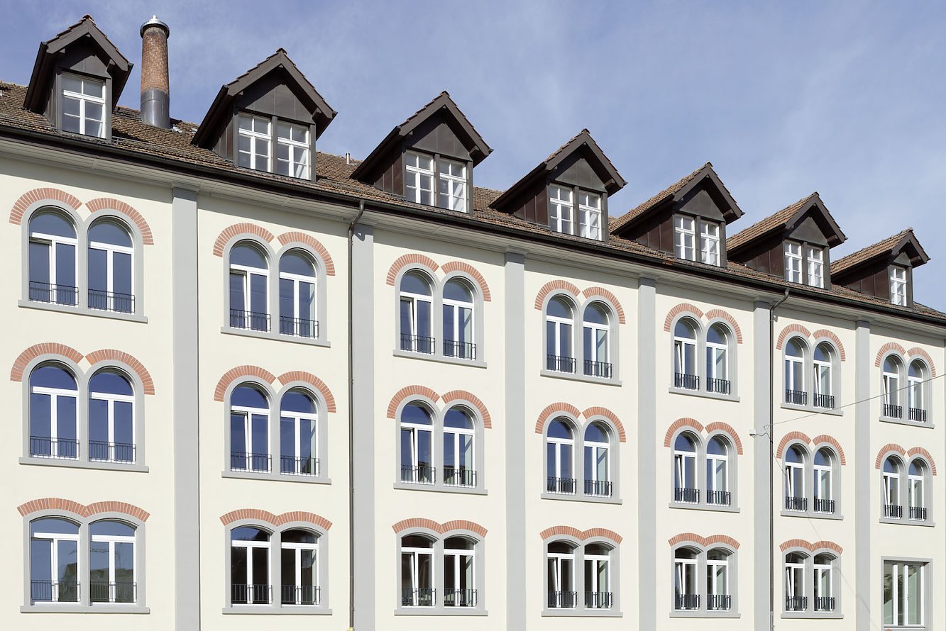 Die älteste Fabrik ist als identitätsstiftende Komponente integriert und durch den Einbau von 12 Loftwohnungen, ergänzt durch einen Treppenturm und eine Balkonschicht, reaktiviert. Die innenliegenden Nasszellen gliedern die Grundrisse in spannungsvolle Raumsequenzen. Details der alten Fabrik wurden spielerisch in die Sanierung eingestreut, um der Vergangenheit eine würdige Reminiszenz zu erweisen.