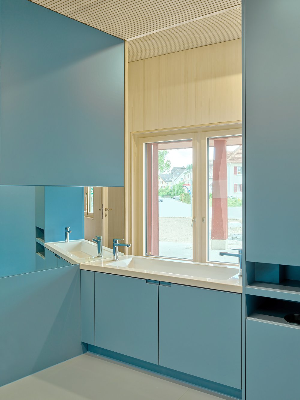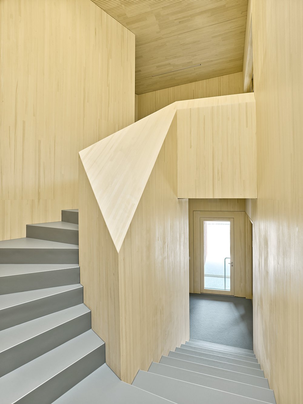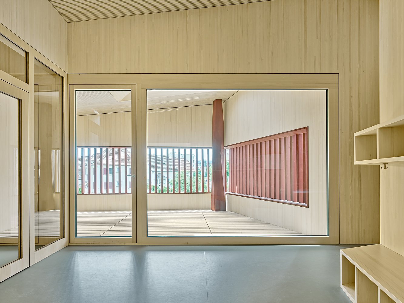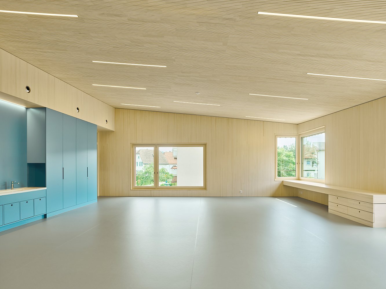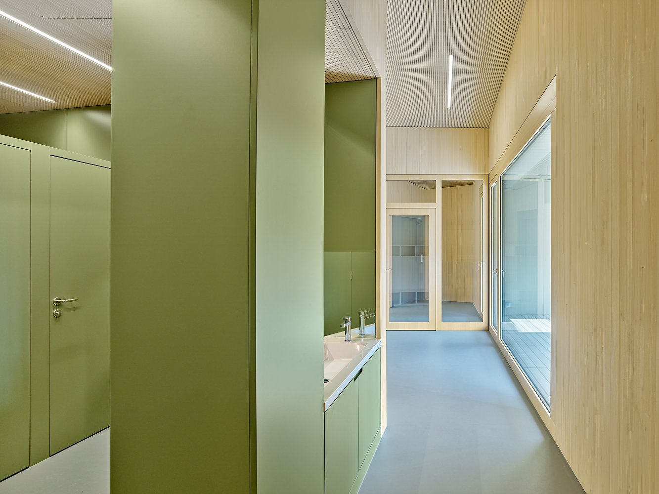 Im Innern sind die zwei Kindergärten auf je ein Geschoss gelegt. Dabei wird ein Rundlauf aus Räumen und Nutzungen geschaffen, die dem kindgerechten Alltag entsprechen.
