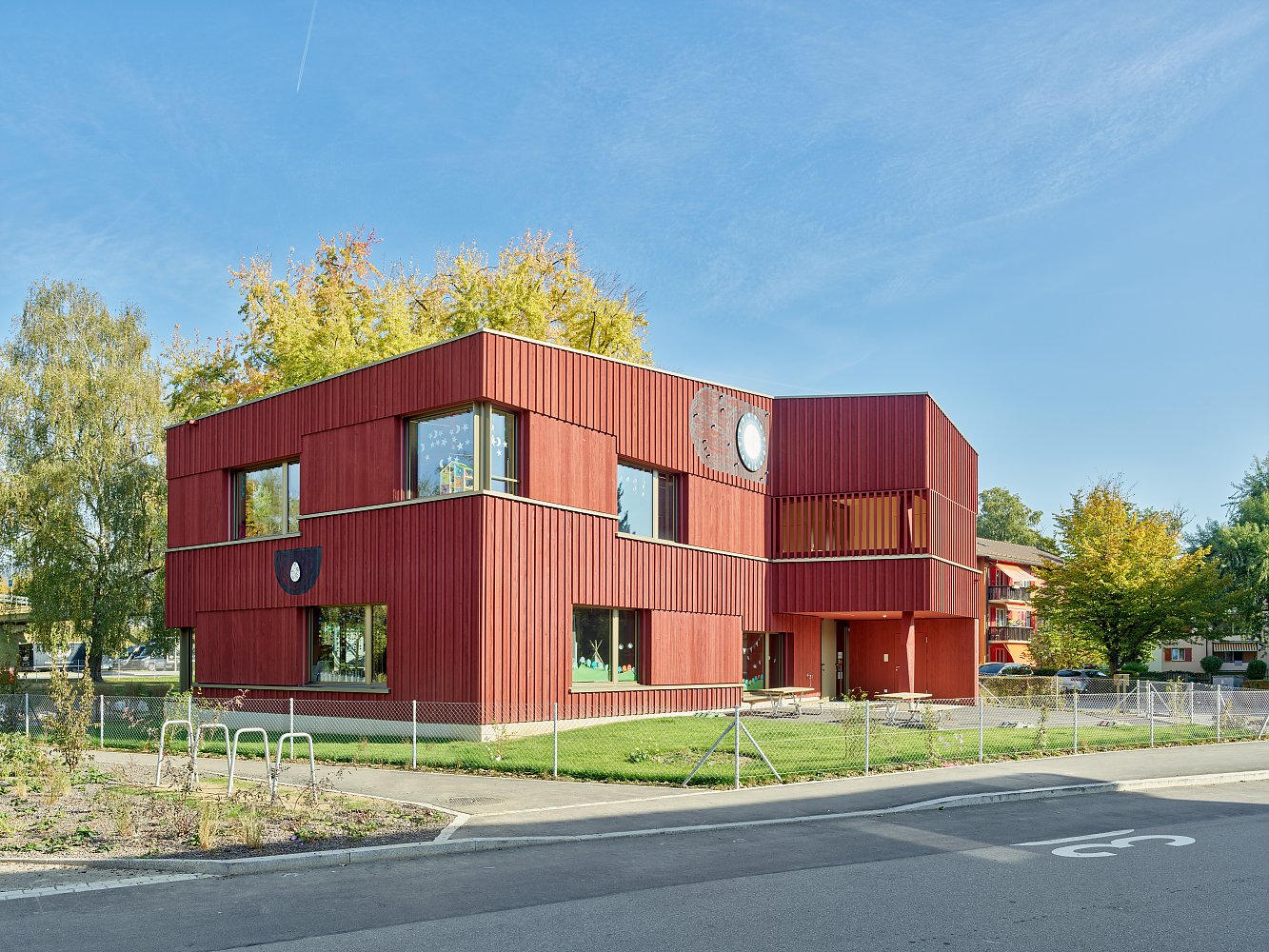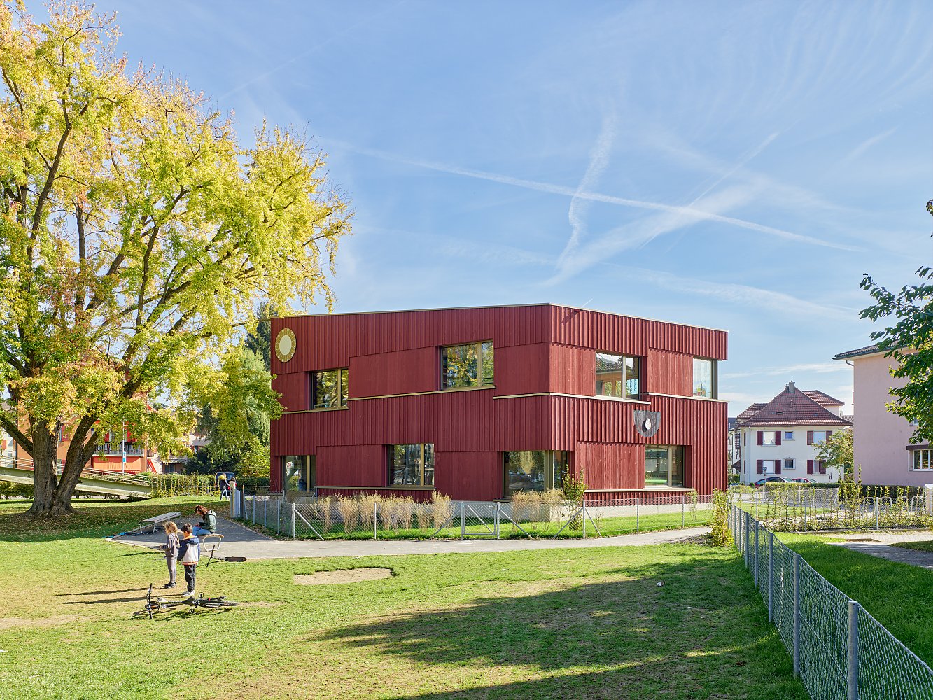 Der neue Doppelkindergarten Gjuch steht auf einer Parzelle, die sich am südlichen Ende einer grünen Landzunge befindet, welche über die Kantonsstrasse bis ins Siedlungsgebiet reicht. Der zweigeschossige Bau wird darauf so weit wie möglich in die Siedlung hinein platziert, sodass er zum städtebaulichen Markstein für den rückwärtigen Quartierpark wird, der aufgrund einer Wasserschutzzone nicht bebaut werden darf.