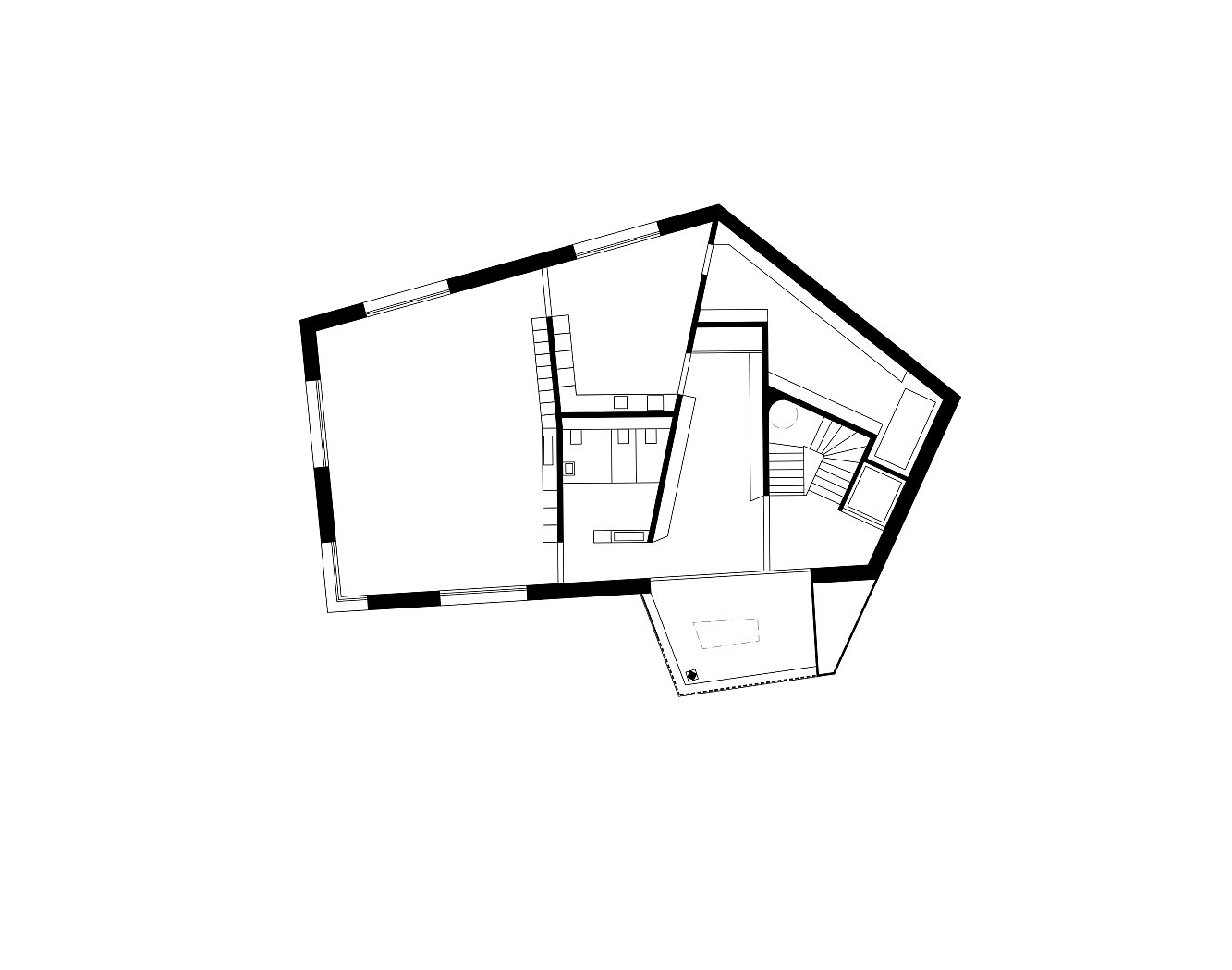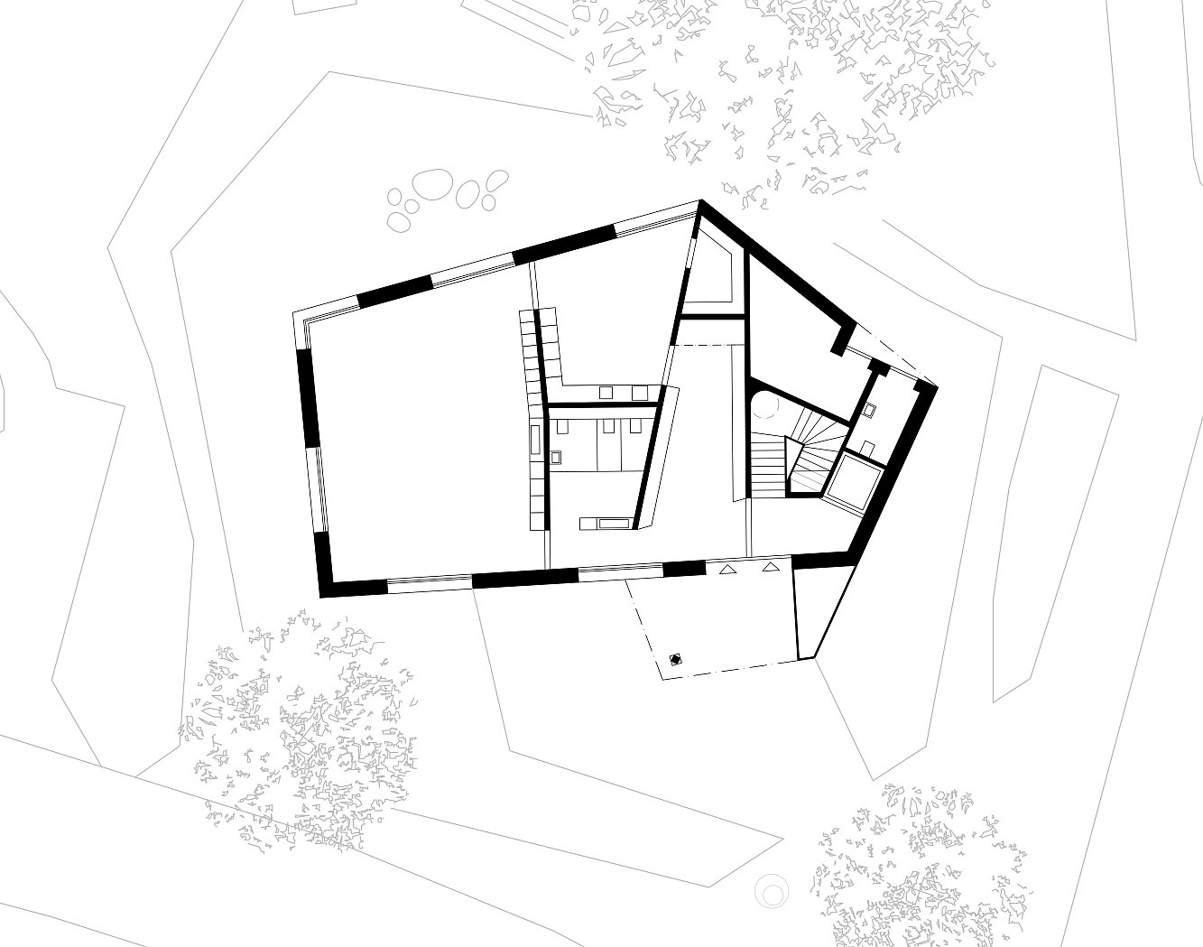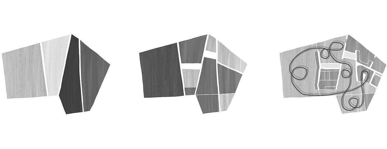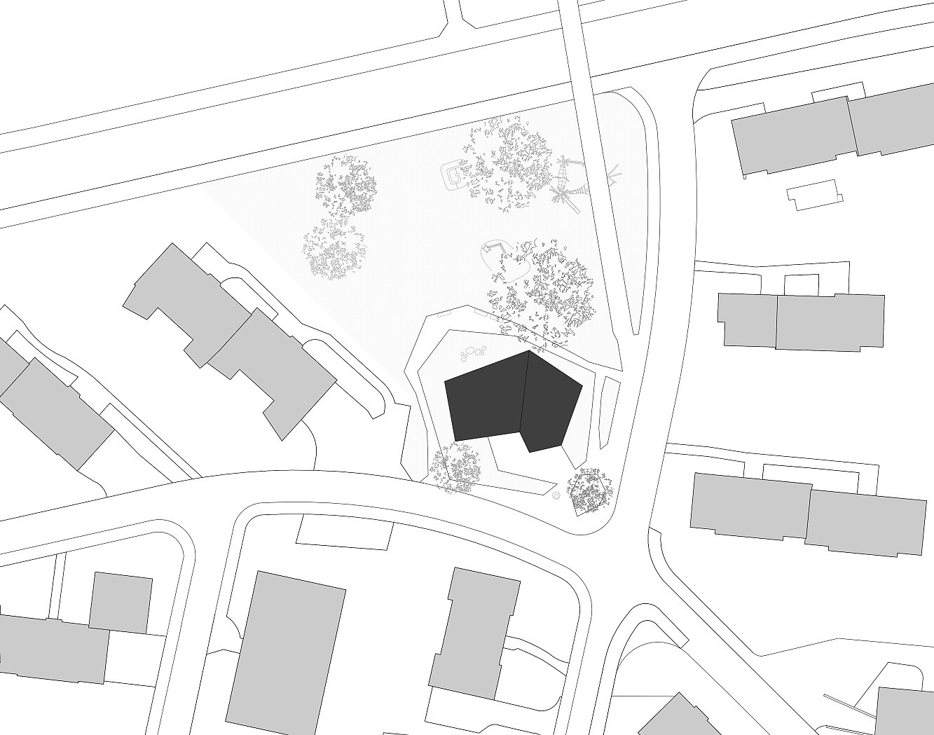 Am vorgesehenen Standort treffen die unterschiedlichen Richtungen der ortstypischen Zeilenbebauung aufeinander. Aus der Überlagerung der verschiedenen Raumfluchten ergibt sich die polygonale Form des neuen Kindergartens. Dank dem austarierten Volumen wird das Gebäude zum Passstück, welches die umliegende Bebauung harmonisch miteinander verlinkt.