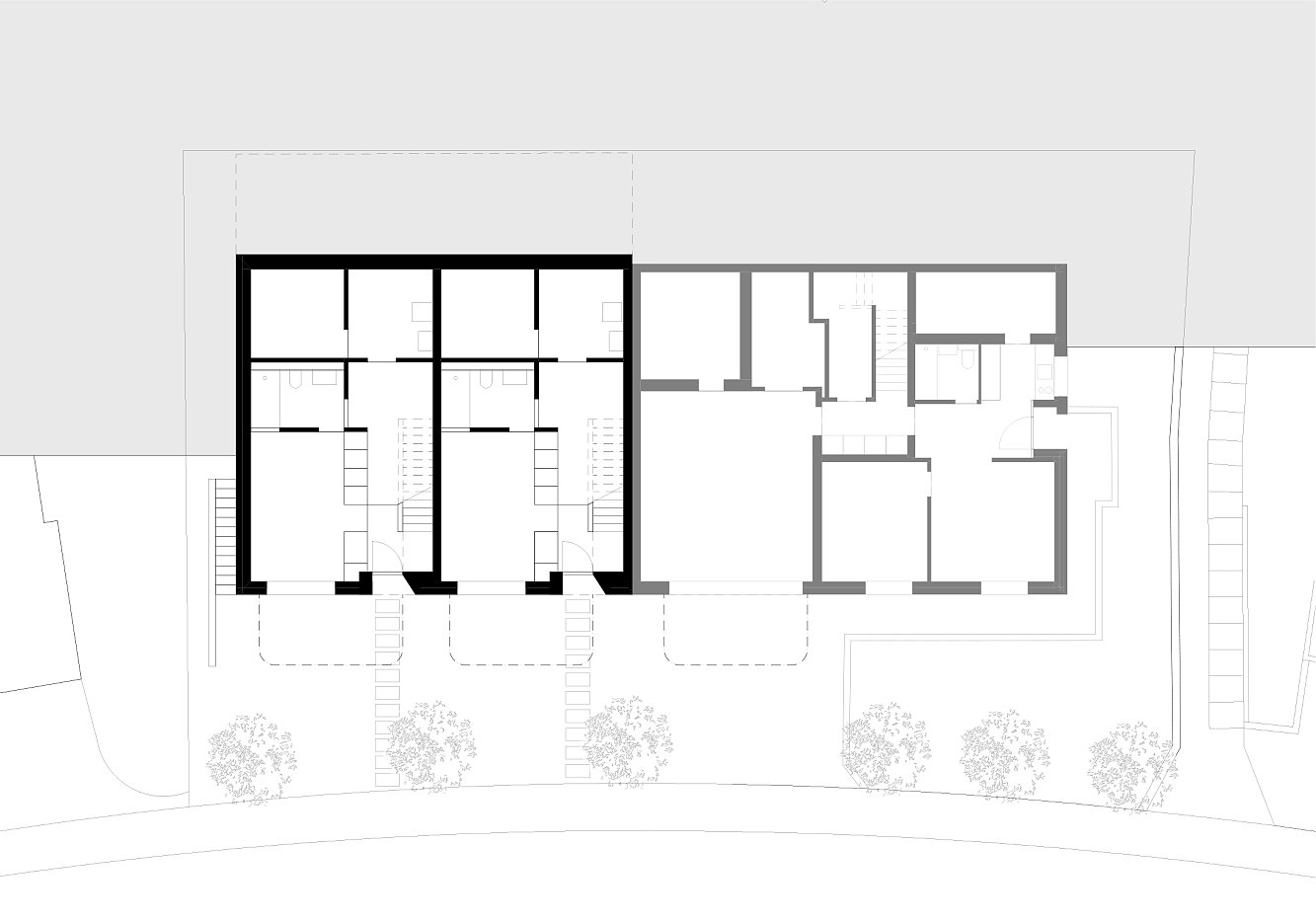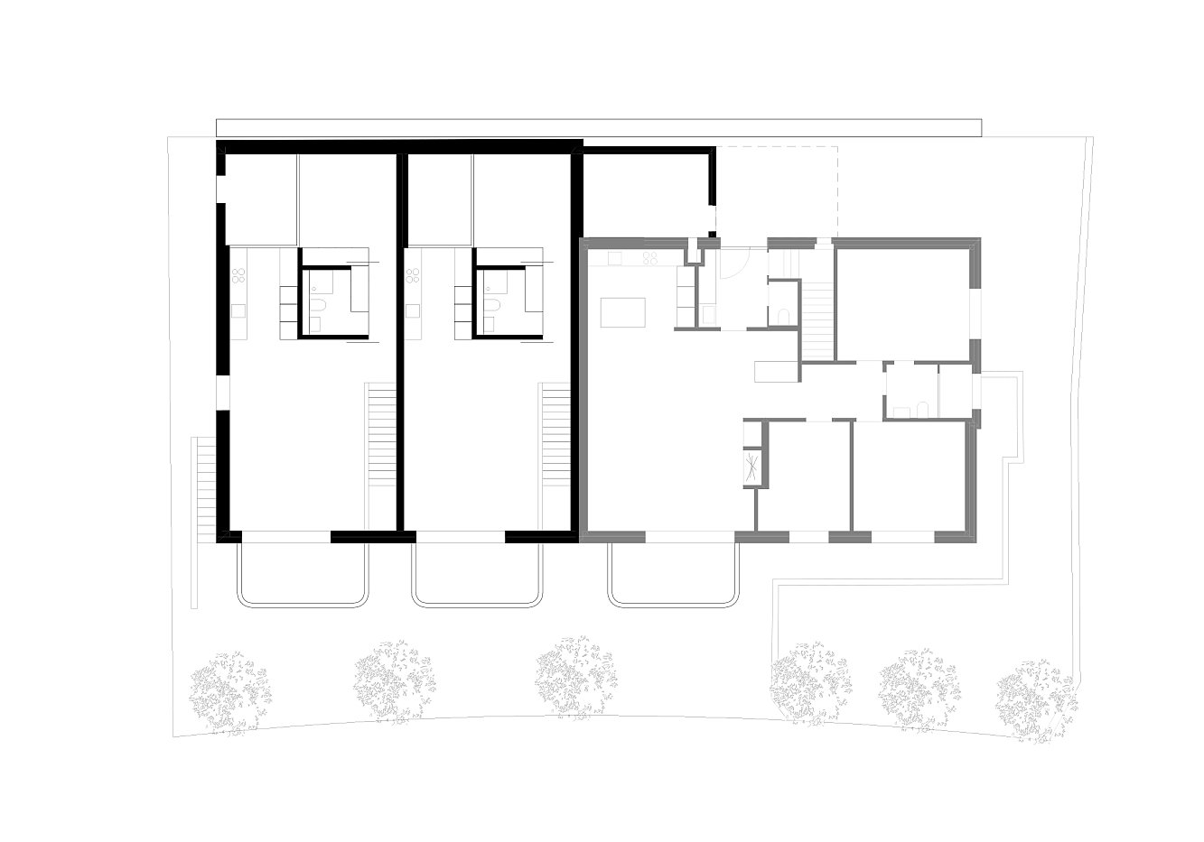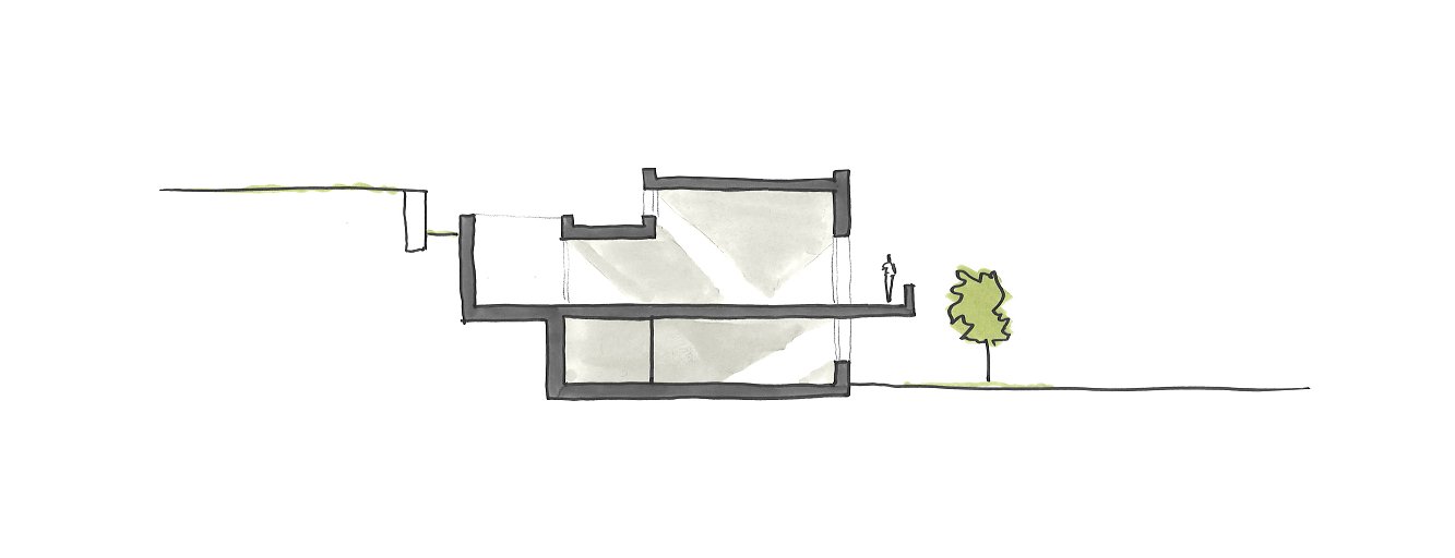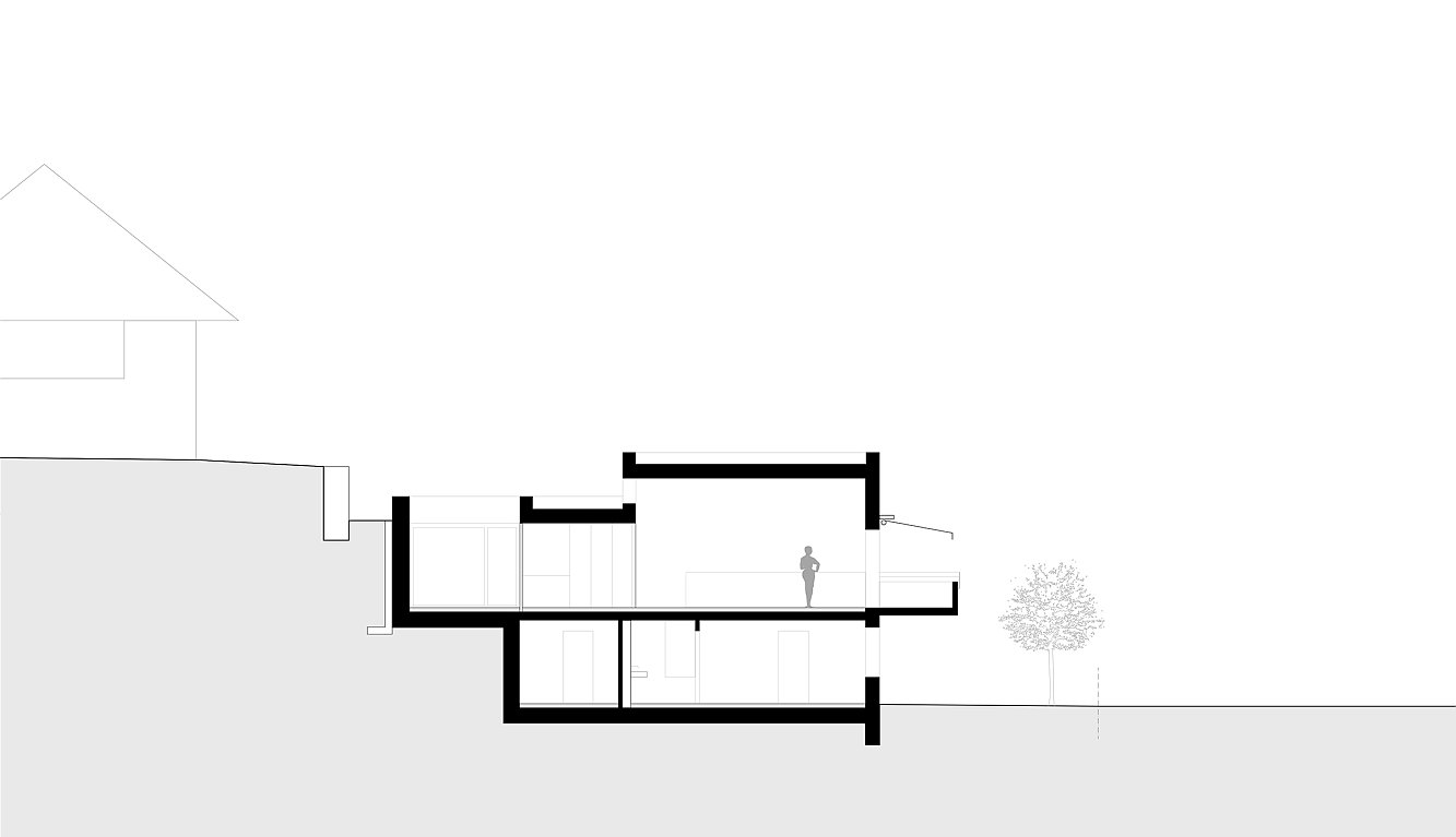 Das ursprüngliche Eternitdach des Bestandes wurde entfernt und mit einem stabilen Flachdach ersetzt, welches den heutigen Dachgarten trägt. Die zwei neuen Einheiten sind separat erschlossen und funktionieren als Maisonette-Wohnungen, die ihr grosszügiges Wohnzimmer, analog zum Bestand, im ersten Obergeschoss finden.