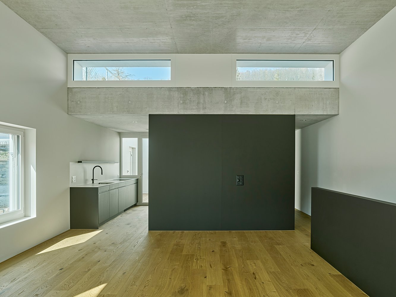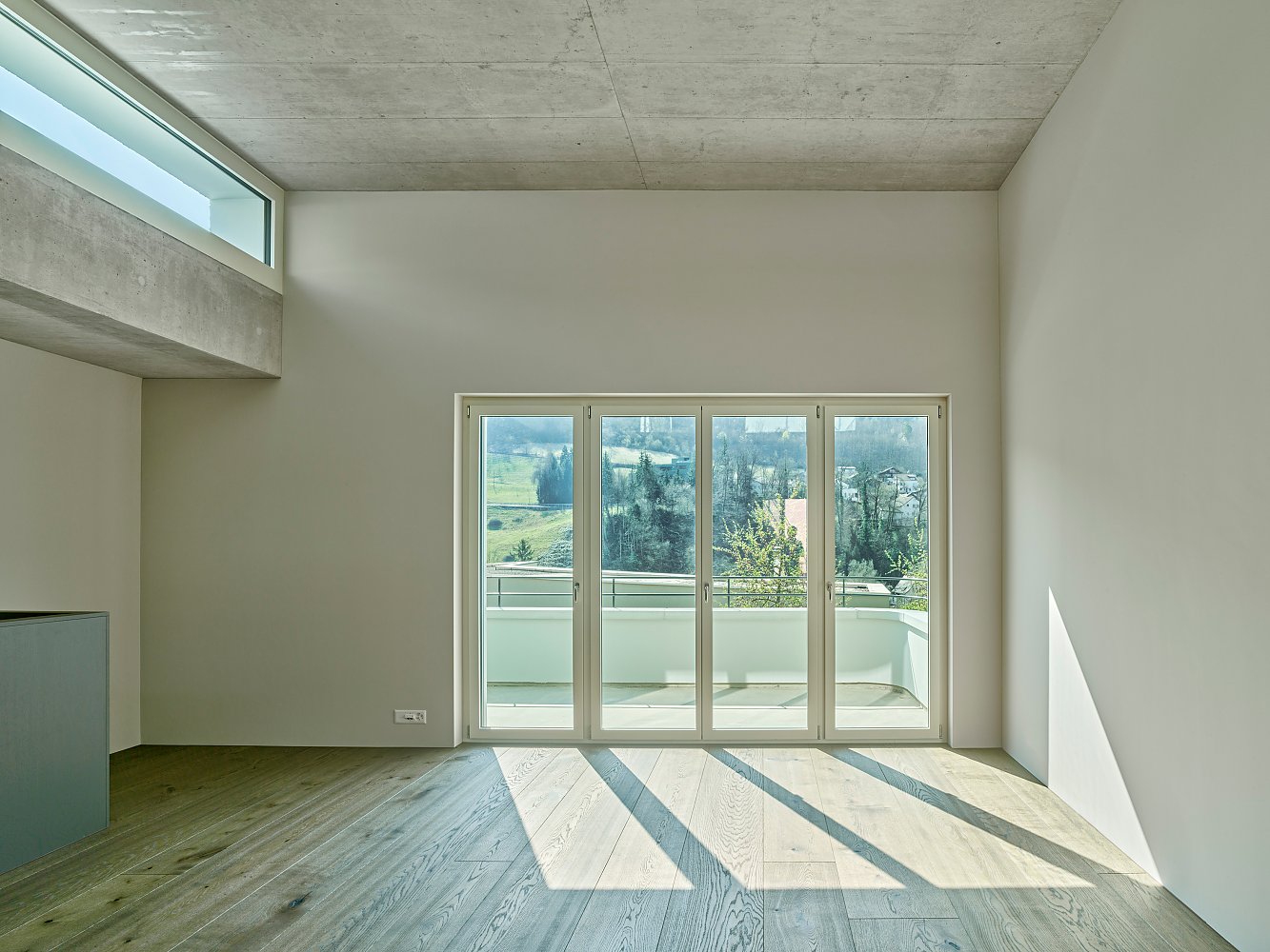Die 3.65m hohen Wohnräume geniessen Licht, Luft und Aussicht von Ennetbaden und erhalten durch die südlich orientierten Balkone ihren sonnigen Aussenraum. Im rückliegenden Bereich der Wohnung bietet ein Patio das Pendant zum sonnigen Balkon und spendet Licht in die privaten Räume.