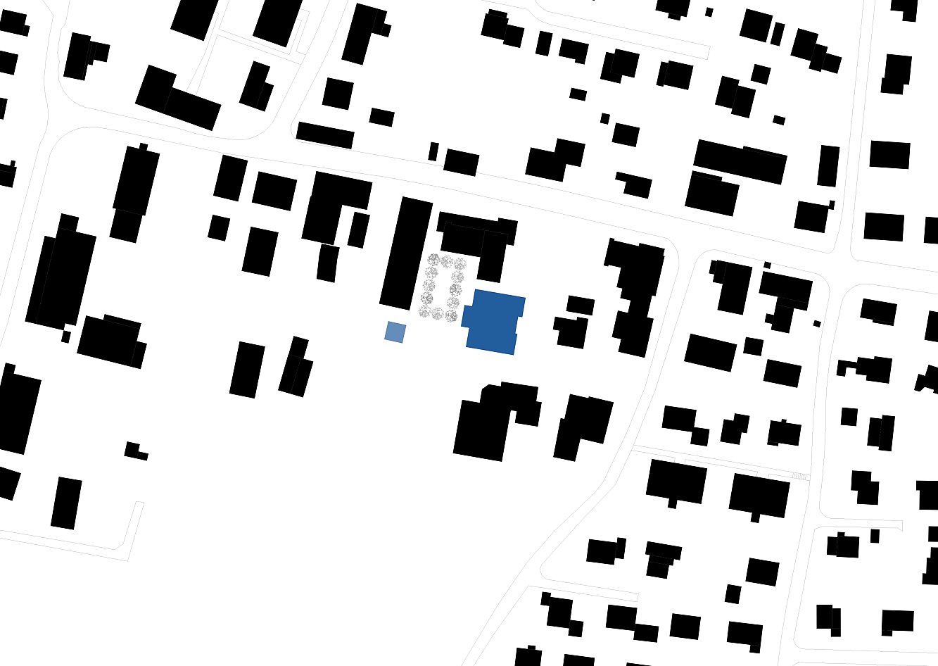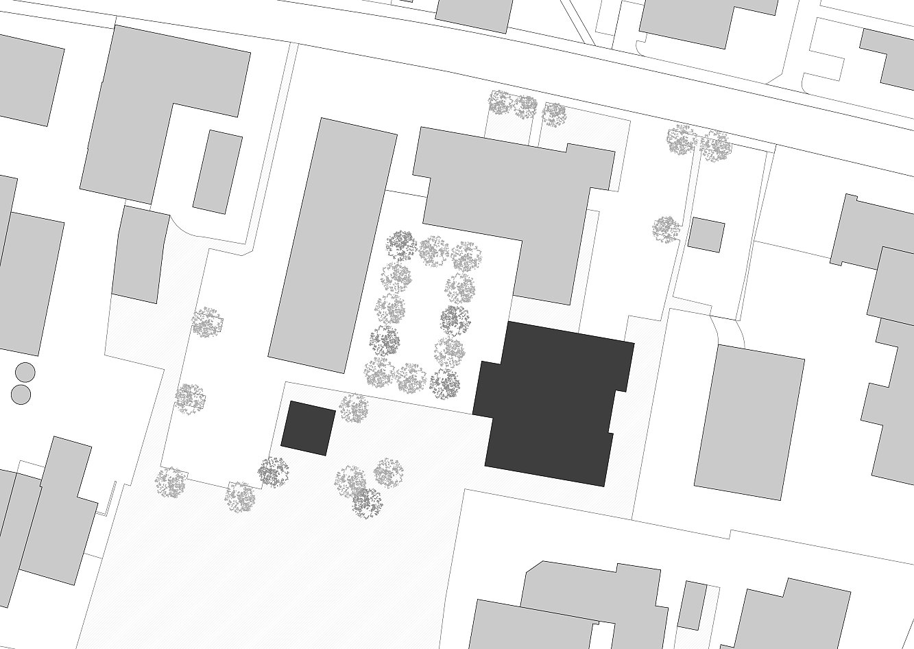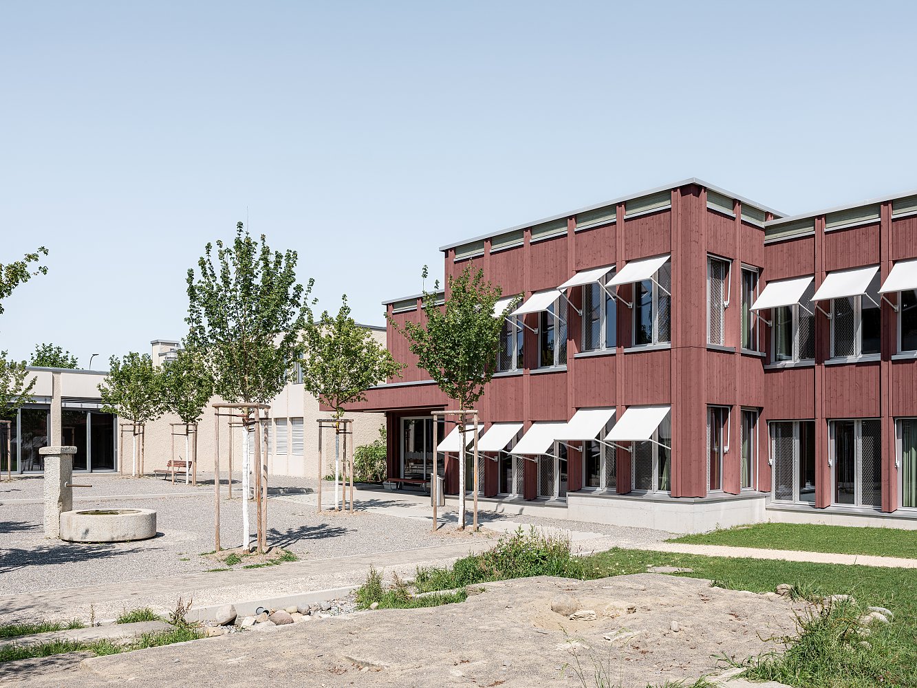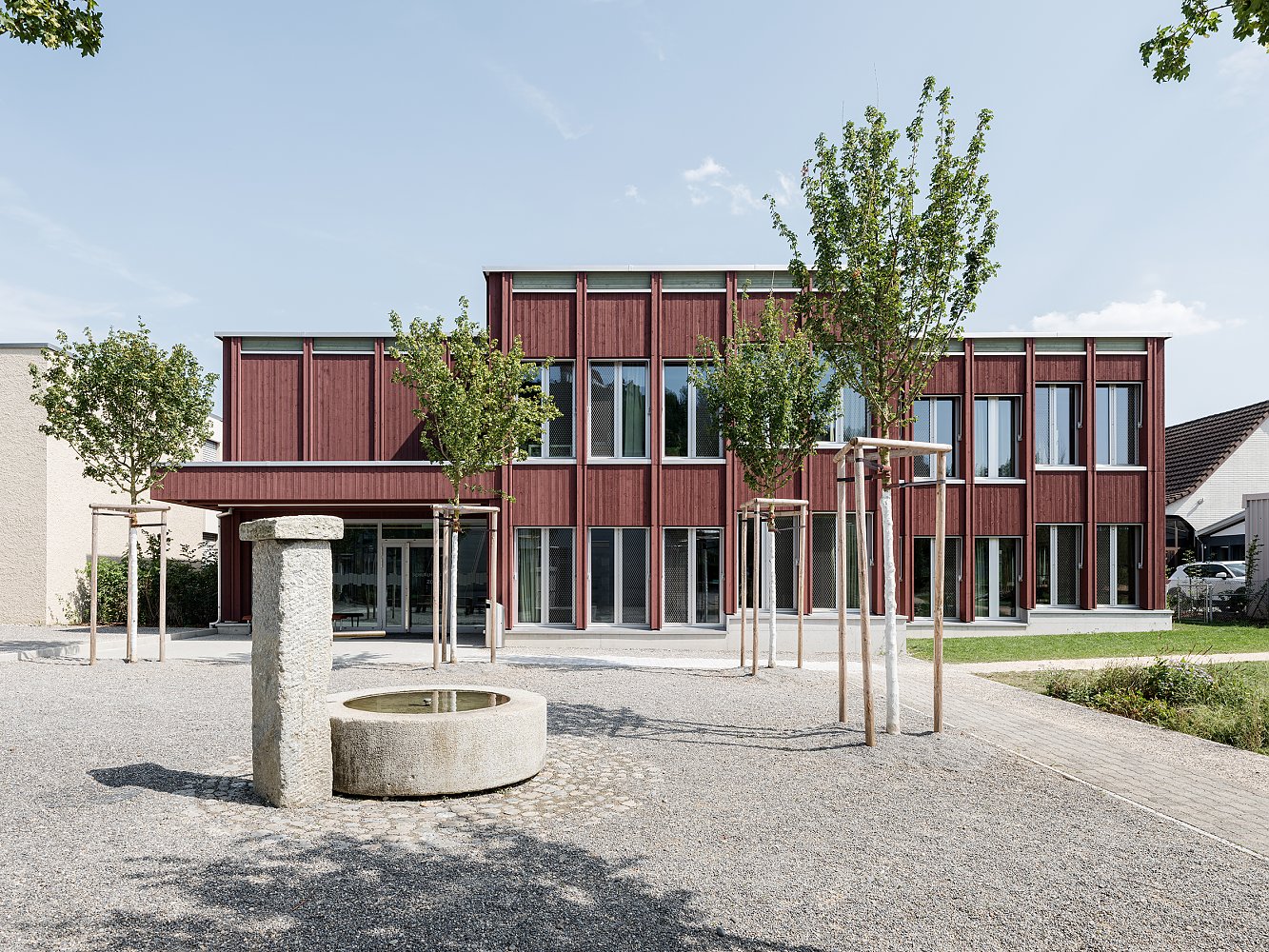 Das neue Schulhaus ergänzt die öffentliche Nutzung auf dem Perimeter, der bereits das Gemeindehaus sowie ein „Zopfhaus“ genanntes Veranstaltungsgebäude aufnimmt. Anstatt die kleinen Nutzer von der etablierten Welt der Erwachsenen zu separieren, wurde ein integrativer Ansatz verfolgt und so ist das neue Schulhaus nicht etwa auf dem südlich gelegenen Freiraum, sondern direkt an die bestehenden Bauten angrenzend positioniert. Dabei formt der Neubau mit dem Gemeinde- und dem Zopfhaus zusammen einen neuen Platz, den Jung und Alt gemeinsam beleben.