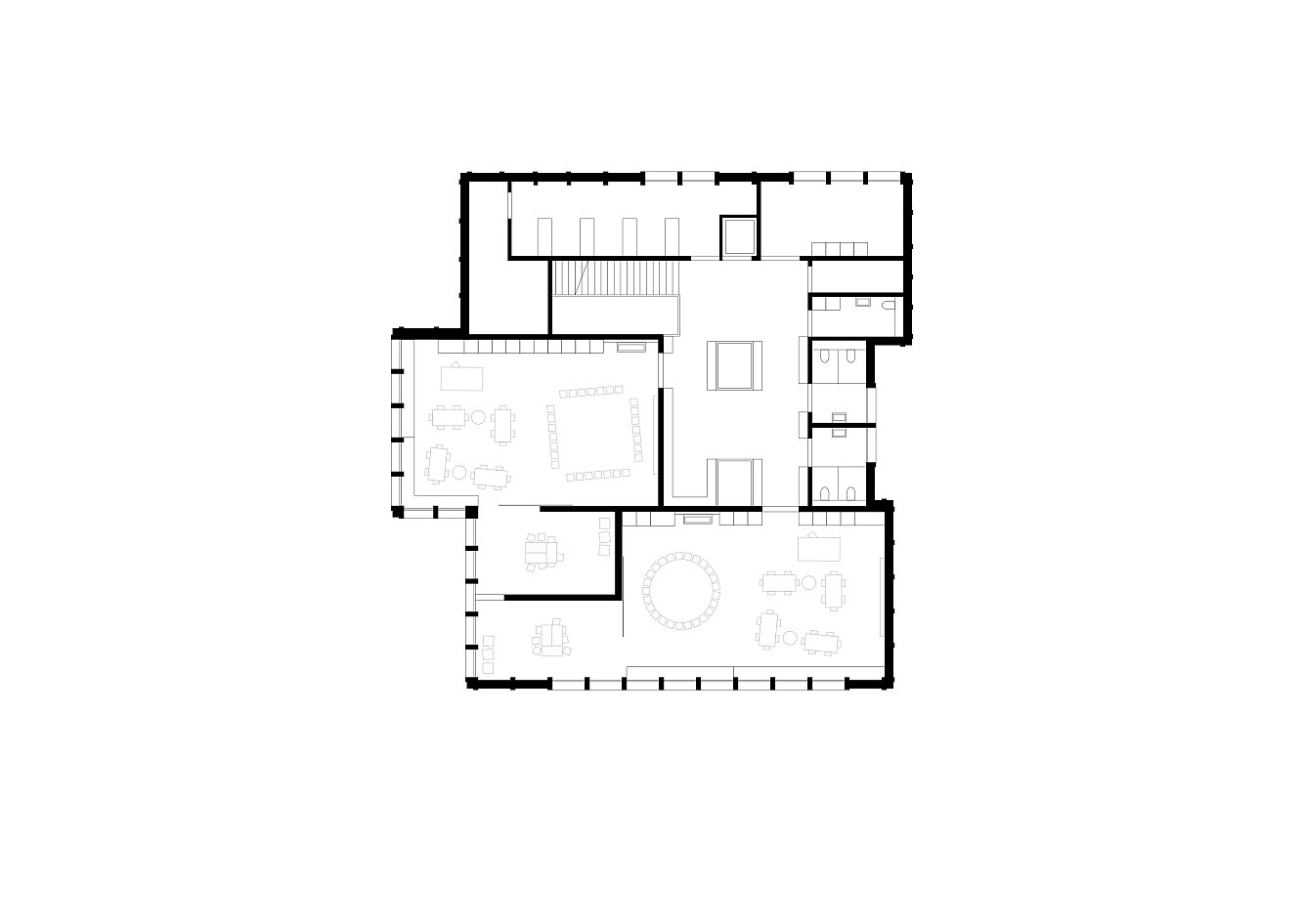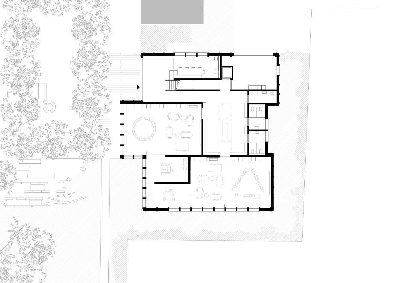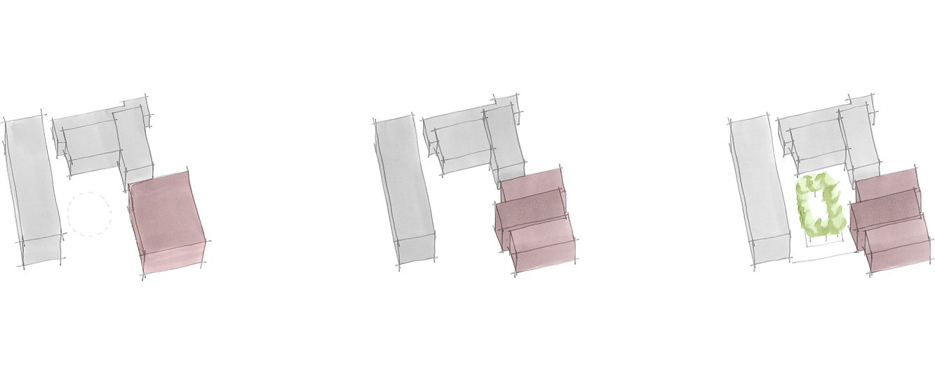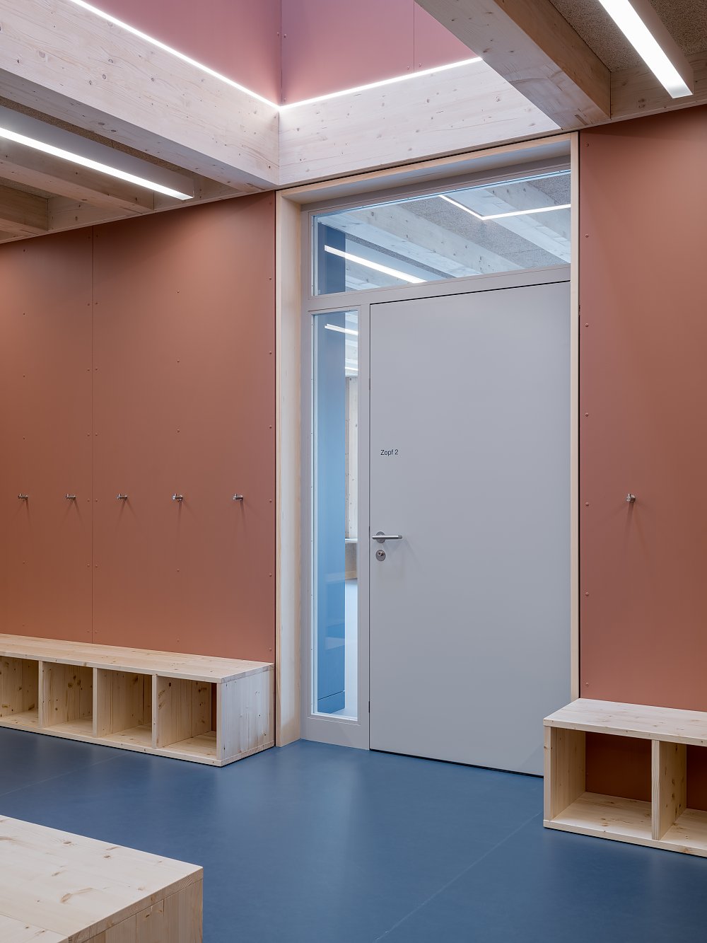 Das neue Schulhaus ergänzt die öffentliche Nutzung auf dem Perimeter, der bereits das Gemeindehaus sowie ein „Zopfhaus“ genanntes Veranstaltungsgebäude aufnimmt. Anstatt die kleinen Nutzer von der etablierten Welt der Erwachsenen zu separieren, wurde ein integrativer Ansatz verfolgt und so ist das neue Schulhaus nicht etwa auf dem südlich gelegenen Freiraum, sondern direkt an die bestehenden Bauten angrenzend positioniert. Dabei formt der Neubau mit dem Gemeinde- und dem Zopfhaus zusammen einen neuen Platz, den Jung und Alt gemeinsam beleben.