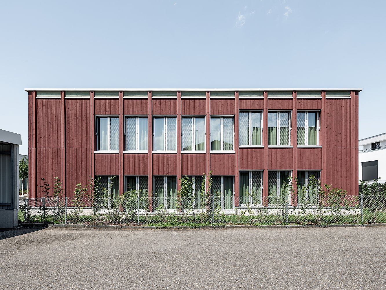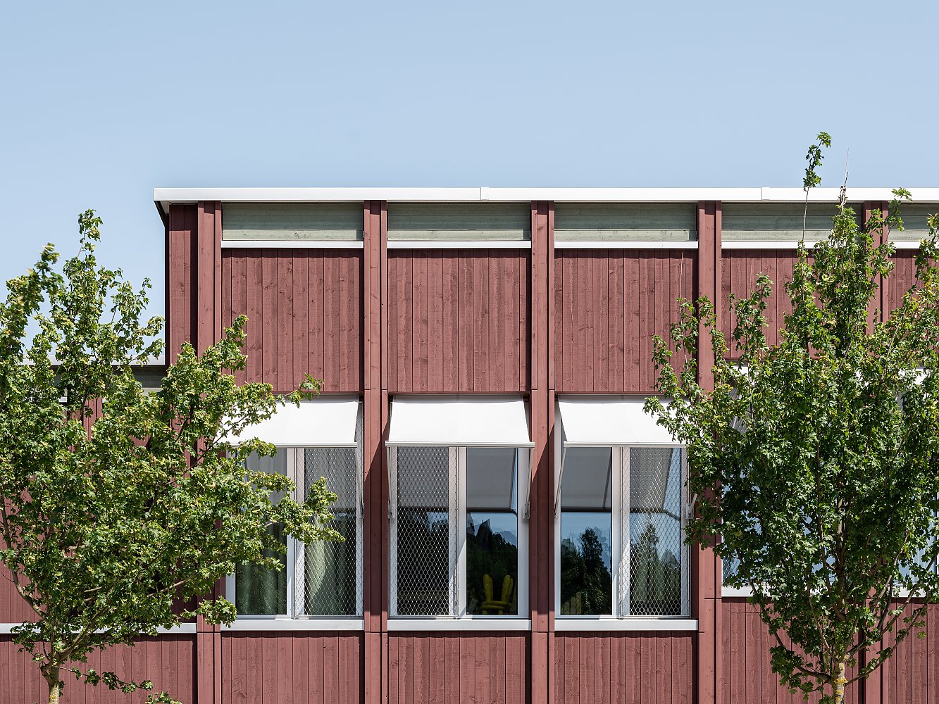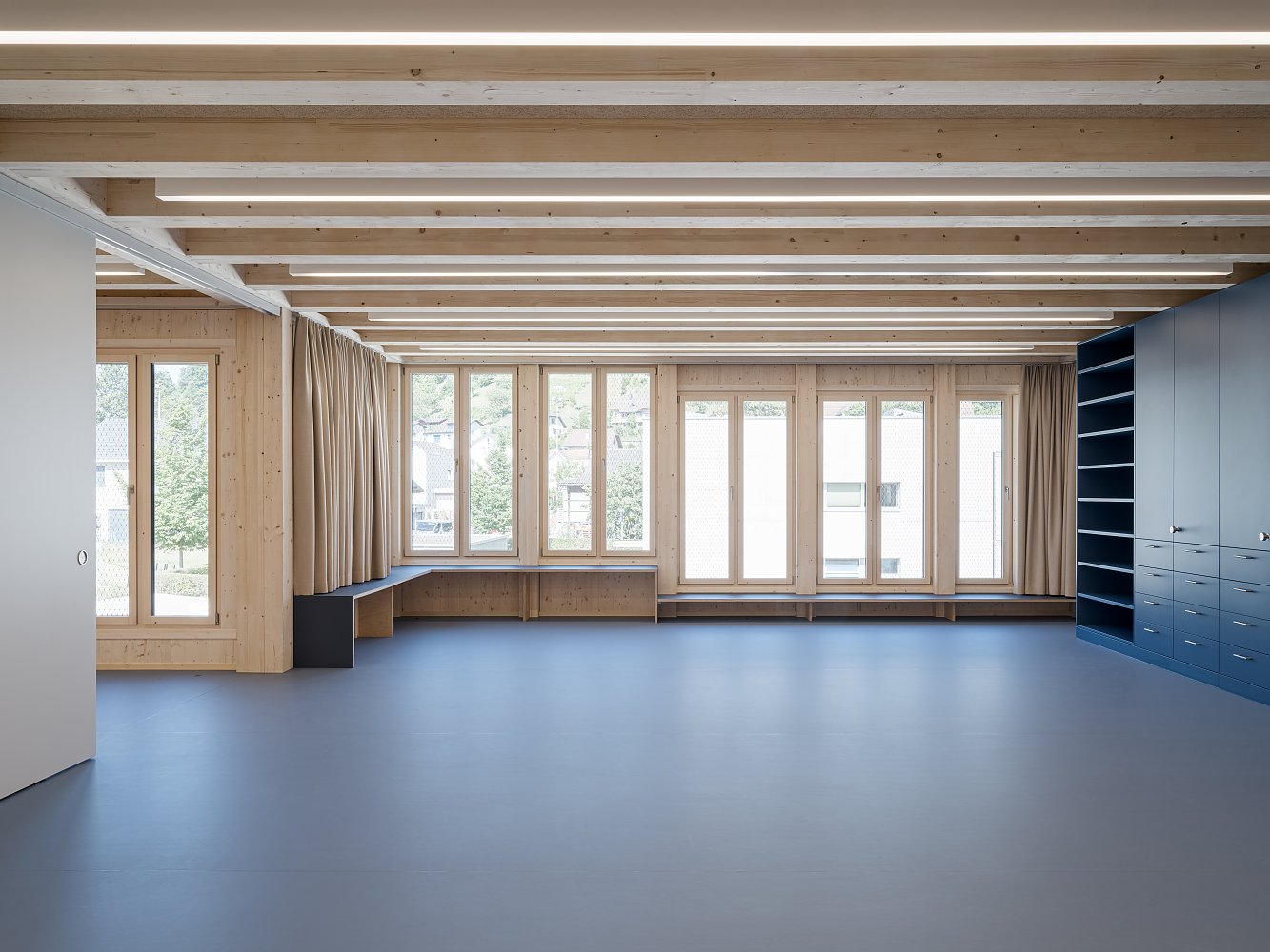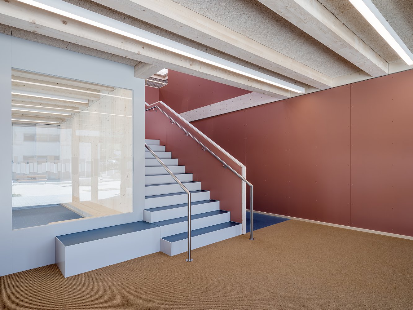 Der Neubau ist ein Holzbau, dessen stringentes System aus Holzbalken und -stützen das Gebäude rhythmisch gliedert. Die Strenge der Konstruktion wird spielerisch durch die Fassadengestaltung gebrochen, deren Fenster auf unterschiedlichen Höhen zu liegen kommen. Die Fensterbänke werden als Sitzbänke oder Schreibtische genutzt. Während sich das Holz nach Innen mit seiner natürlichen Oberfläche zeigt, präsentiert sich die gestrichene Gebäudefassade nach aussen am neuen Dorfplatz als dezenter Farbakzent.