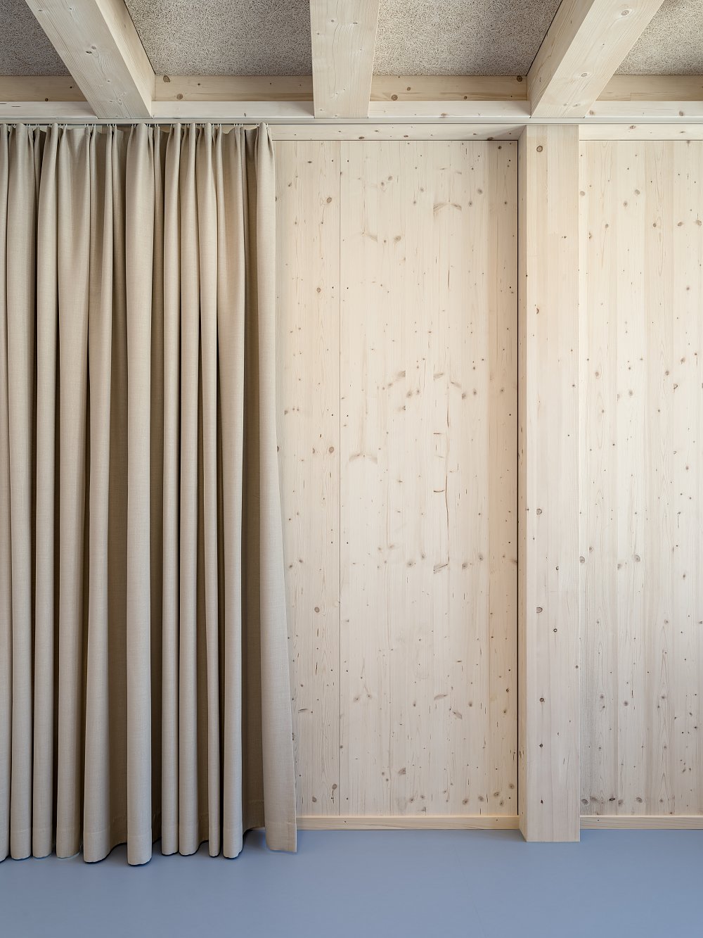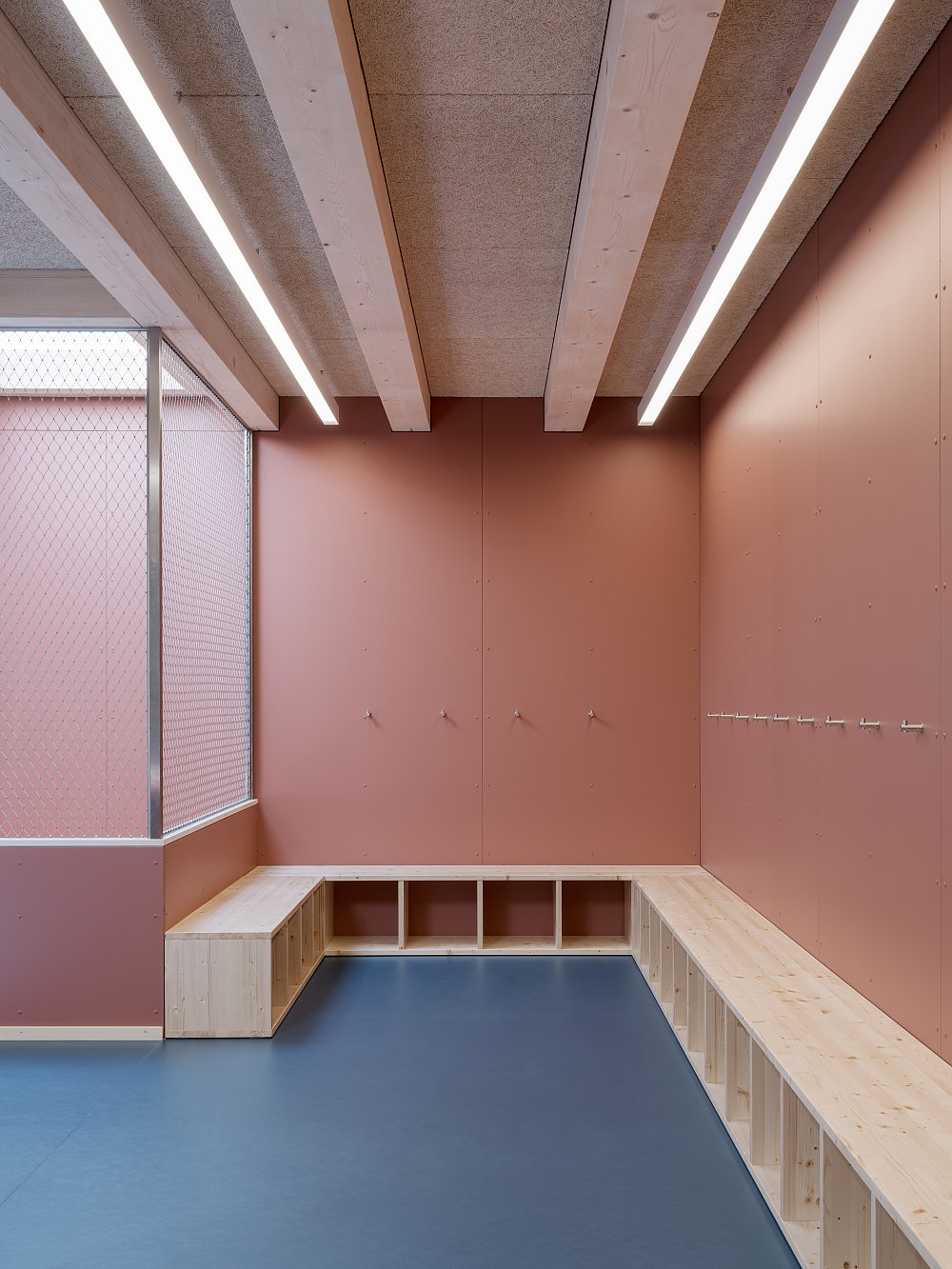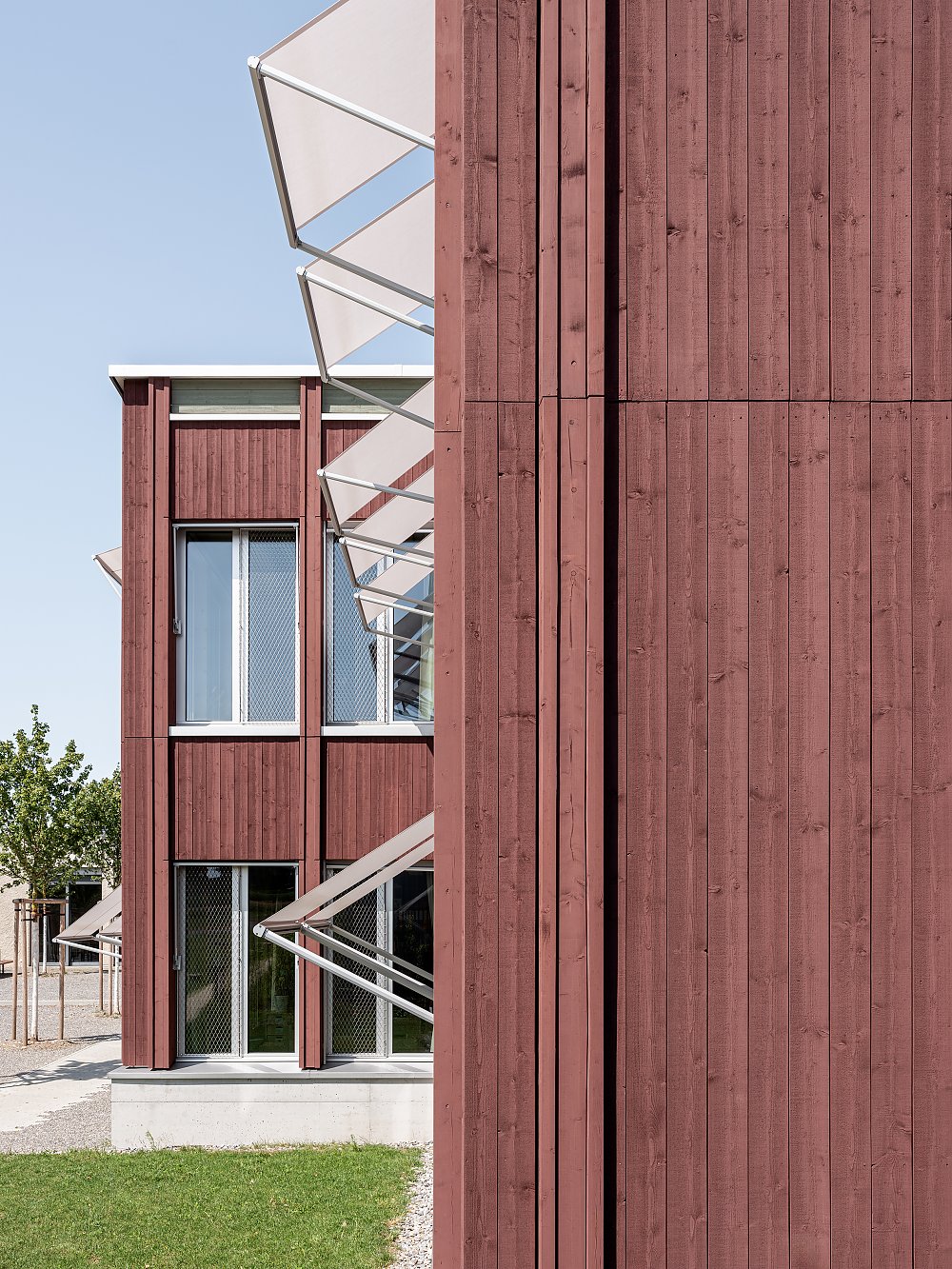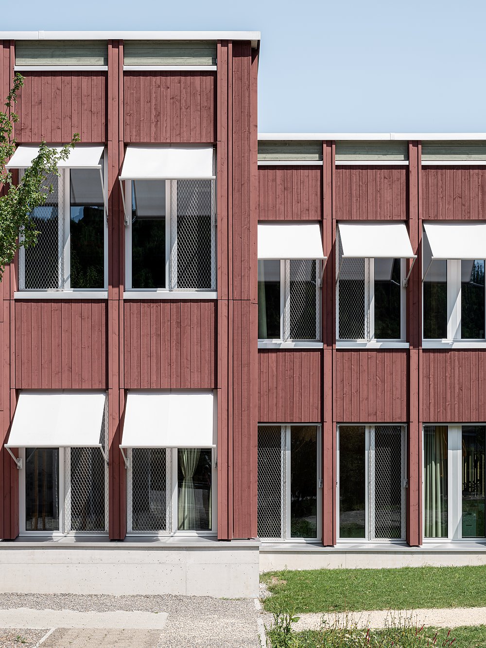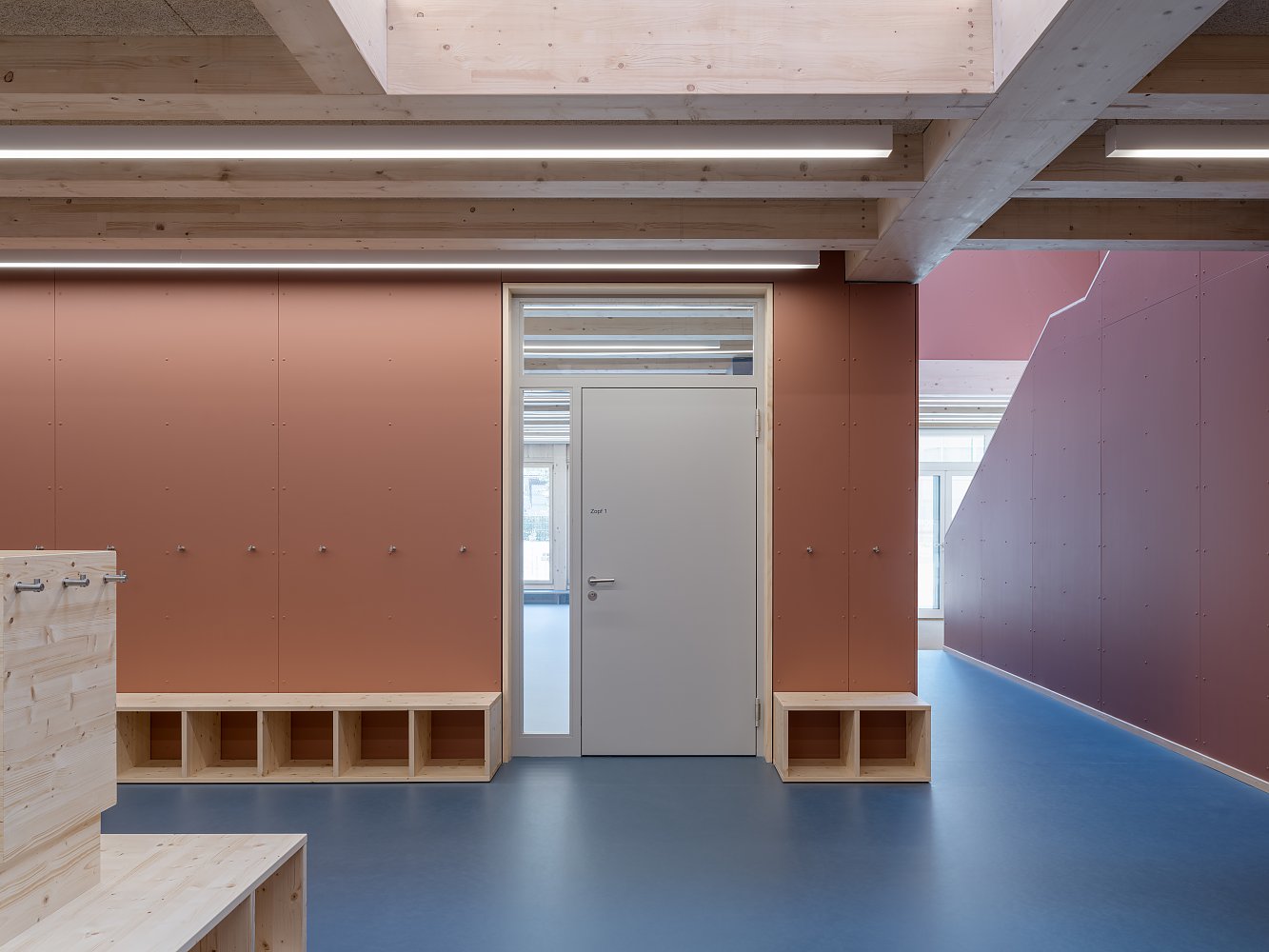Der Neubau ist ein Holzbau, dessen stringentes System aus Holzbalken und -stützen das Gebäude rhythmisch gliedert. Die Strenge der Konstruktion wird spielerisch durch die Fassadengestaltung gebrochen, deren Fenster auf unterschiedlichen Höhen zu liegen kommen. Die Fensterbänke werden als Sitzbänke oder Schreibtische genutzt. Während sich das Holz nach Innen mit seiner natürlichen Oberfläche zeigt, präsentiert sich die gestrichene Gebäudefassade nach aussen am neuen Dorfplatz als dezenter Farbakzent.