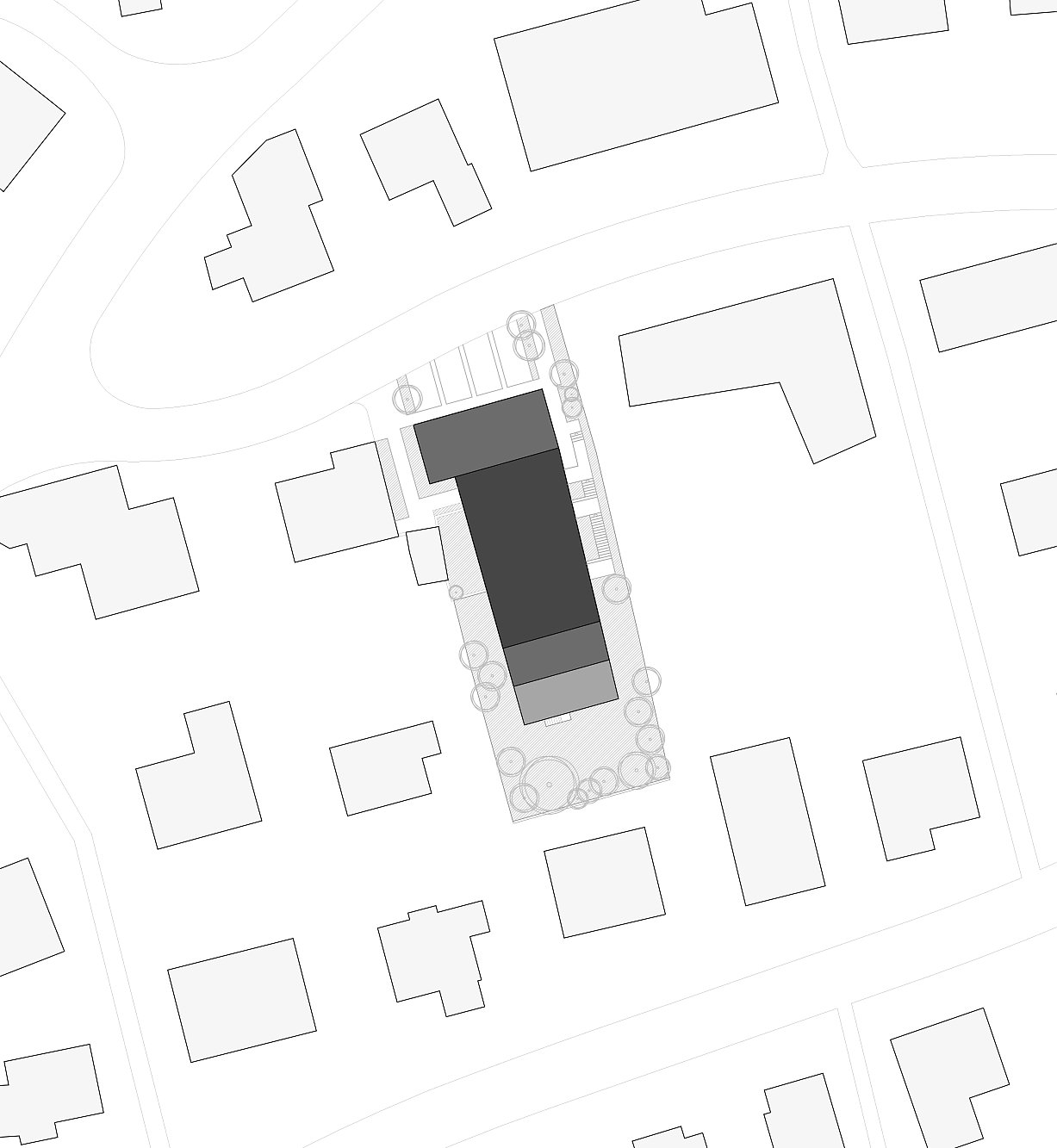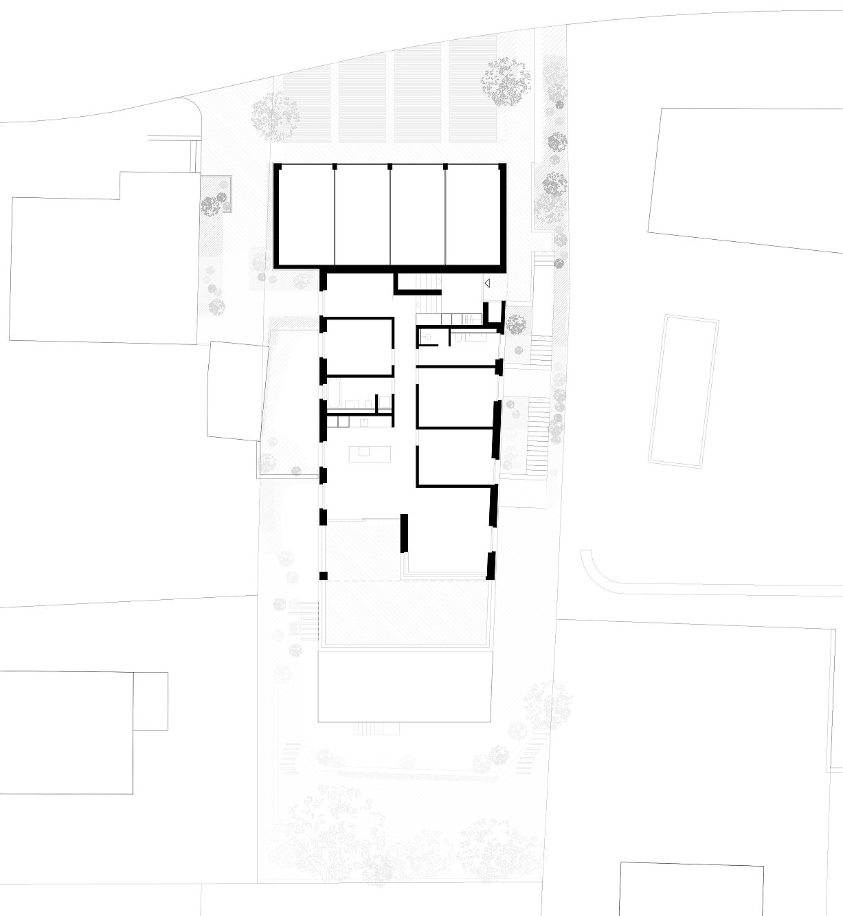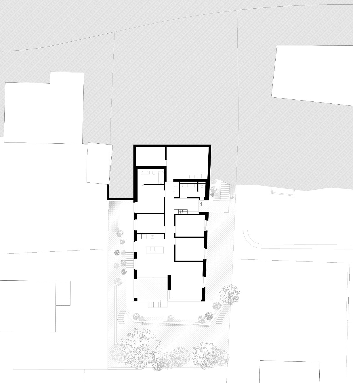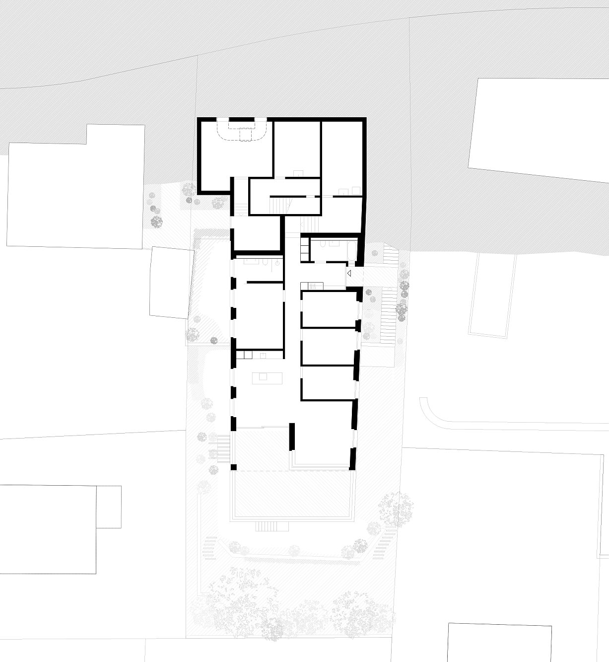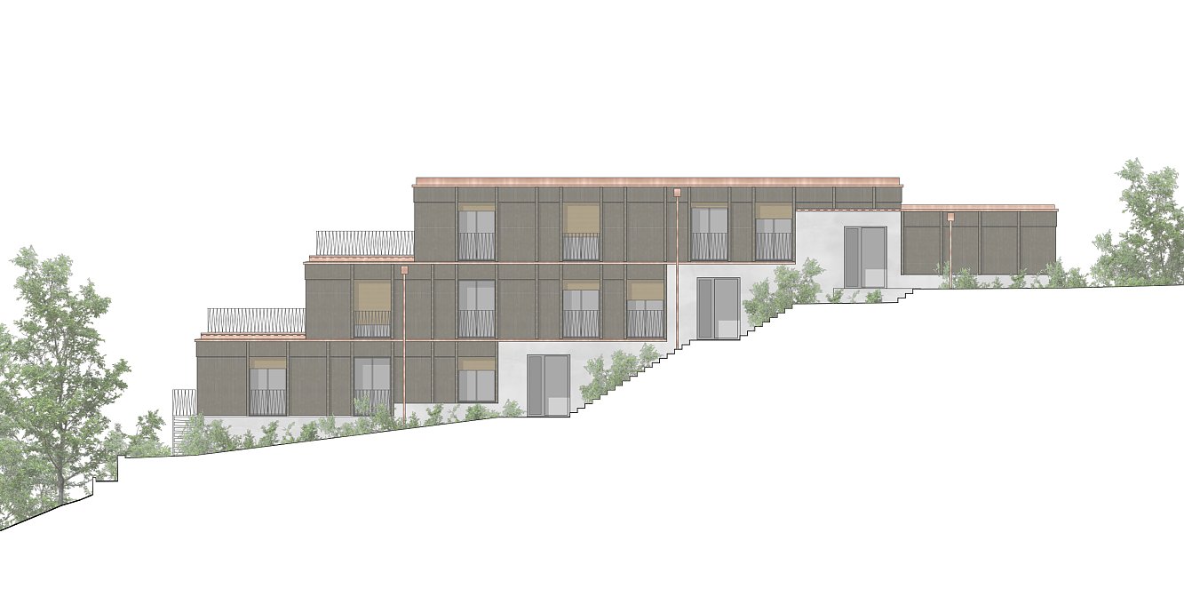 Inmitten eines gewachsenen Einfamilienhausquartiers an der Schlierenstrasse in Ennetbaden fügt sich das terrassierte Wohnhaus behutsam in längliche Parzelle am Hang ein. Das Volumen staffelt sich entlang des natürlichen Geländeverlaufs in mehreren Rücksprüngen, wodurch es trotz seiner Grösse zurückhaltend wirkt und sich der Massstab harmonisch in die Nachbarschaft einfügt. Die gegliederte Bauweise ermöglicht zudem grosszügige Terrassen und eine hohe Qualität der privaten Freiräume auf allen Ebenen.