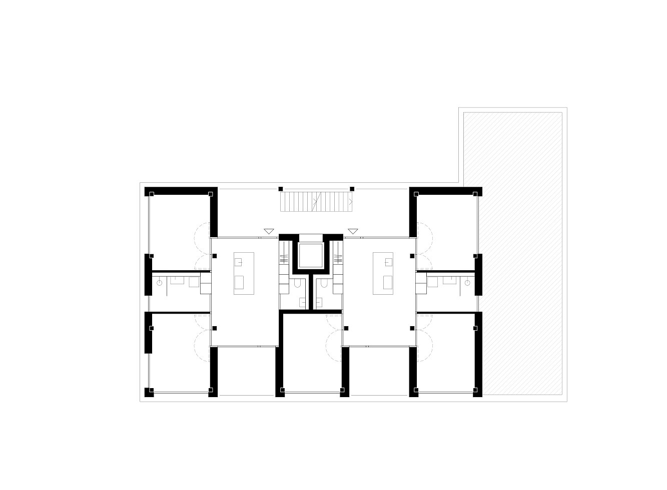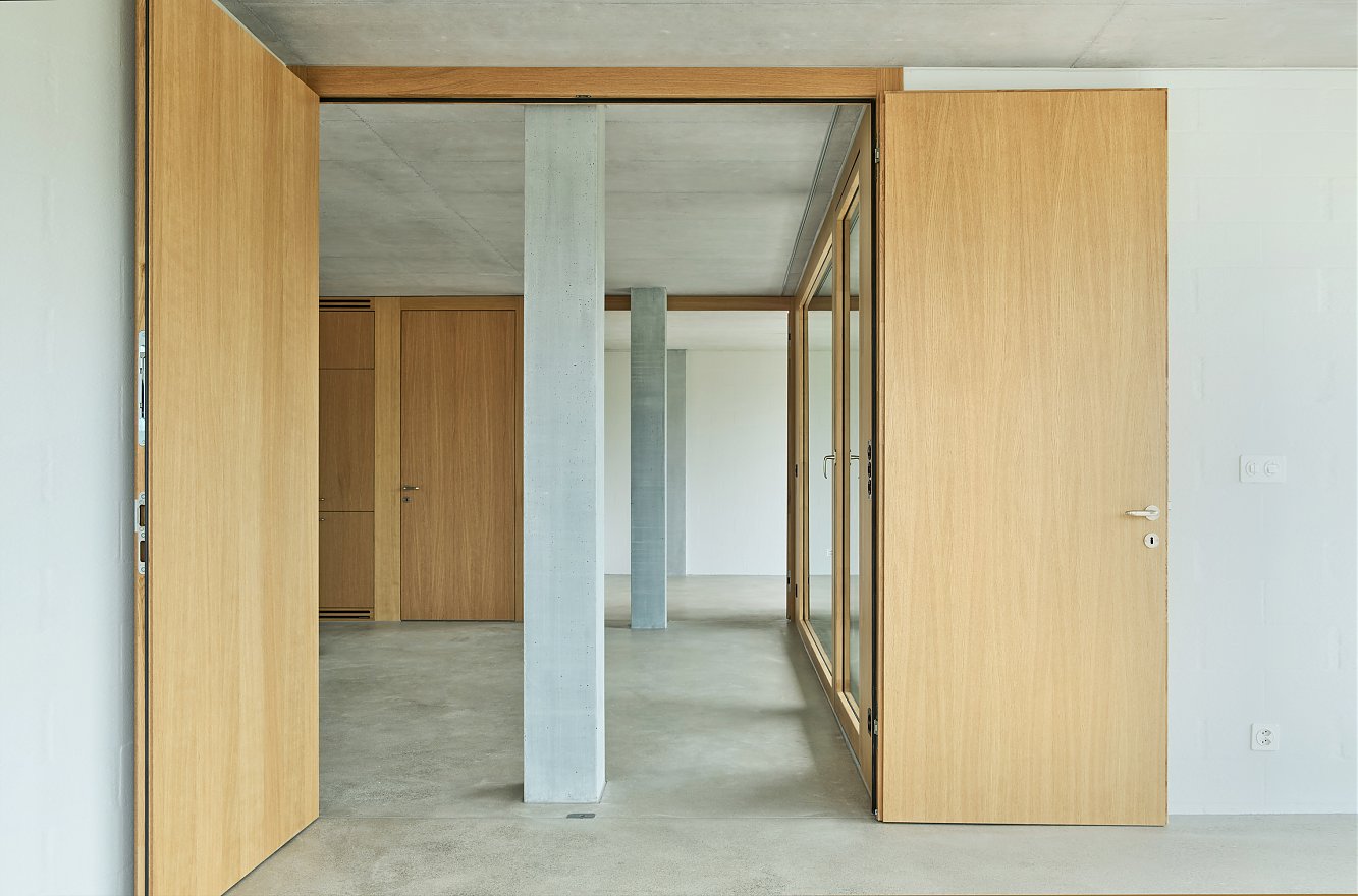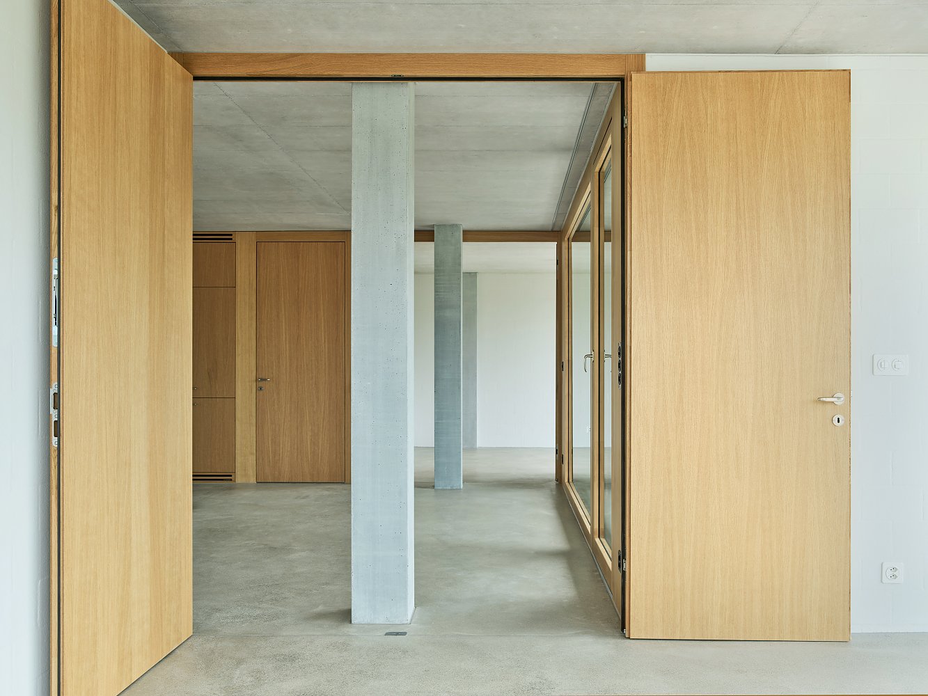 Die übrigen Zimmer gliedern sich um diesen zentralen Raum und können flexibel als Wohn-, Schlaf- oder Arbeitsräume genutzt werden. Grosse, doppelflüglige Türen erlauben individuelle Szenarien: beidseitig geöffnet verbinden sie die Räume zum fliessenden Wohnraum, hälftig geöffnet schaffen sie private Rückzugsorte. Damit kann eine Wohnung gleichsam als grosszügige Wohnlandschaft wie auch als kleinräumigere Wohngemeinschaft genutzt werden.