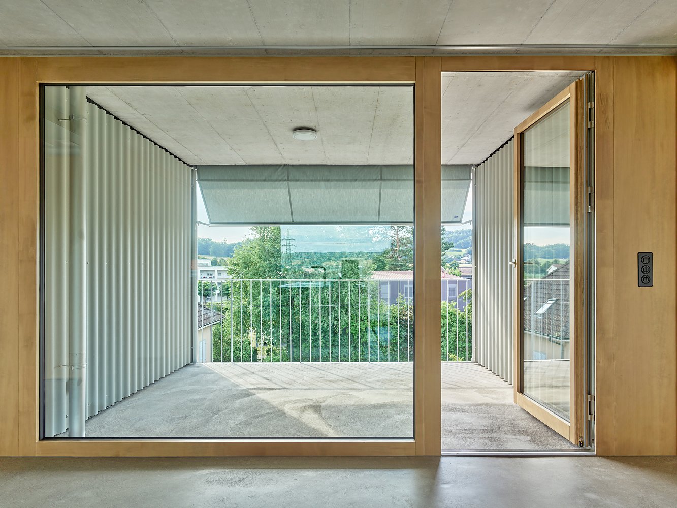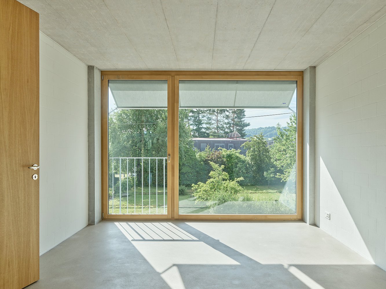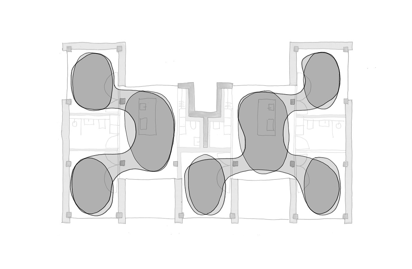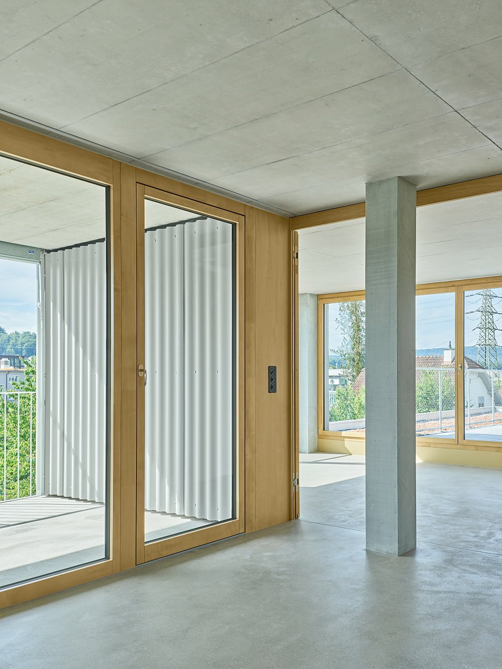 Die übrigen Zimmer gliedern sich um diesen zentralen Raum und können flexibel als Wohn-, Schlaf- oder Arbeitsräume genutzt werden. Grosse, doppelflüglige Türen erlauben individuelle Szenarien: beidseitig geöffnet verbinden sie die Räume zum fliessenden Wohnraum, hälftig geöffnet schaffen sie private Rückzugsorte. Damit kann eine Wohnung gleichsam als grosszügige Wohnlandschaft wie auch als kleinräumigere Wohngemeinschaft genutzt werden.