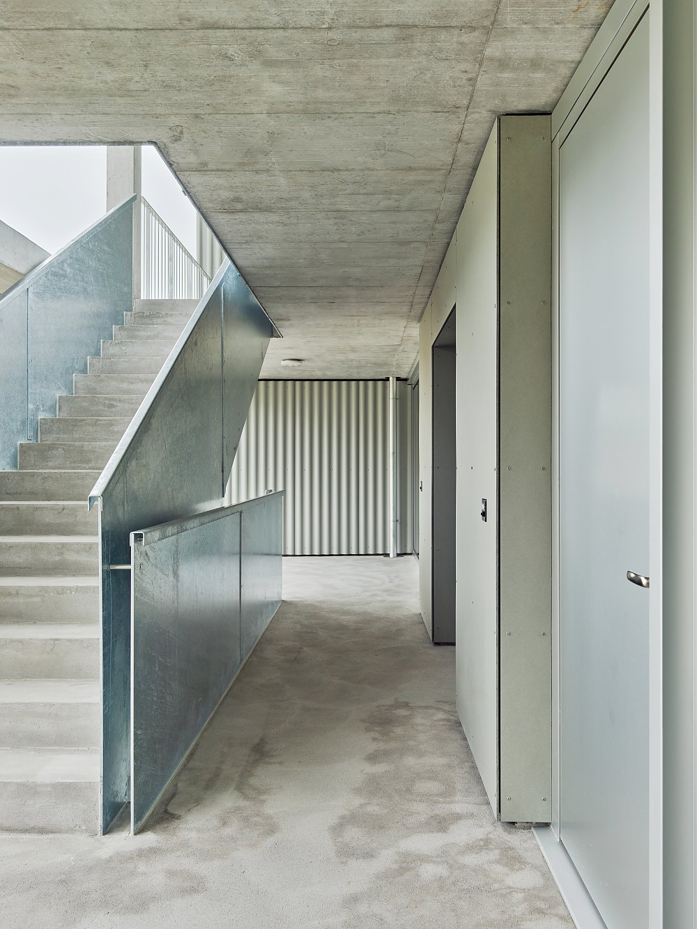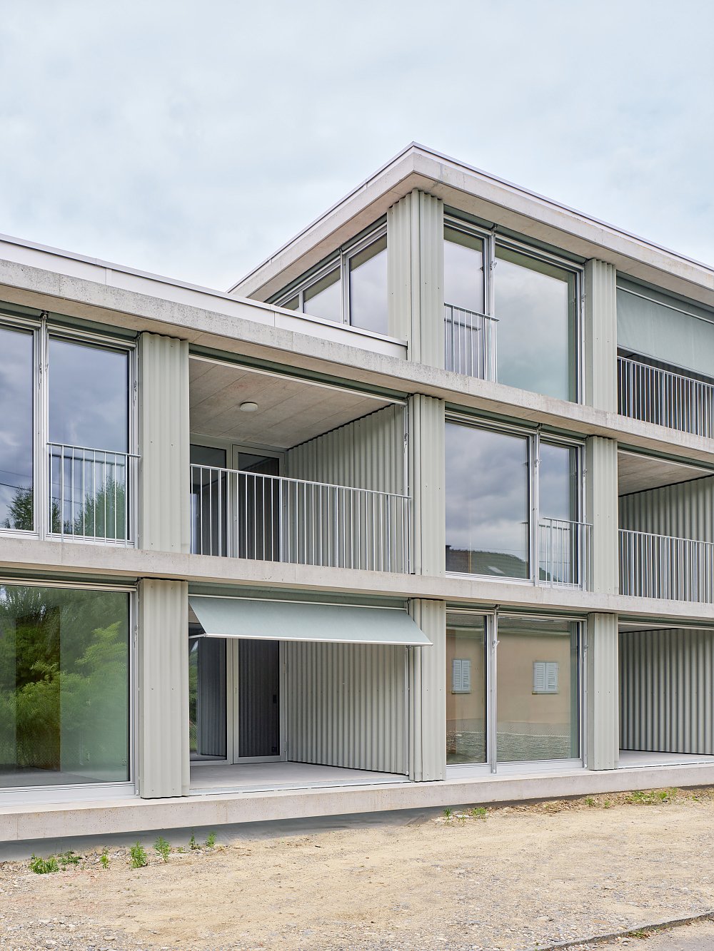 Das äussere Erscheinungsbild ist geprägt von durchlaufenden horizontalen Bändern aus Welleternit, die von markant auskragenden Betonplatten unterbrochen und gegliedert werden. Im Erdgeschoss erweitert sich die Betondecke über die Fassade hinaus, leitet zum Carport über und erzeugt eine klare Adressierung mit einladender Eingangssituation.