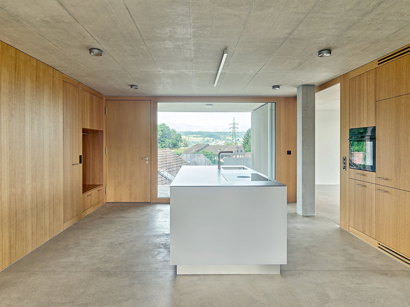 Im Zentrum jeder Wohnung liegt ein grosszügiger, multifunktionaler Raum. Aus der Laube empfängt die zentrale Kochinsel den Bewohner, die gleichsam Empfang, Küche und sozialer Treffpunkt ist. Als Koch-Essbereich genutzt, bietet er Platz für einen grosszügigen Esstisch zwischen Kochinsel und privater Loggia. Seine Oberflächen sind bewusst hochwertig gestaltet – mit warmen Holzverkleidungen, die dem Raum eine besondere Atmosphäre und Identität verleihen.