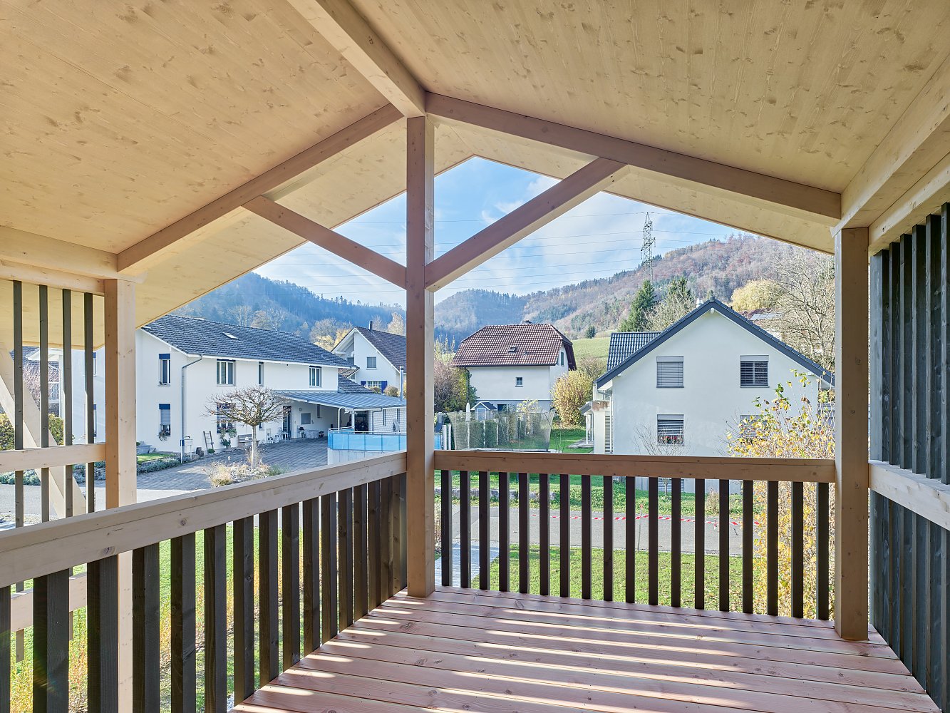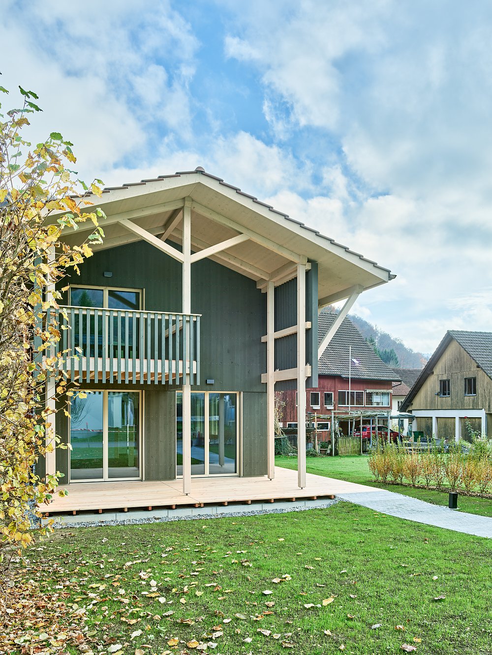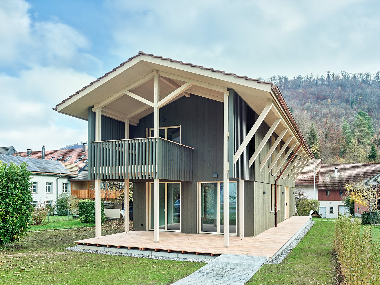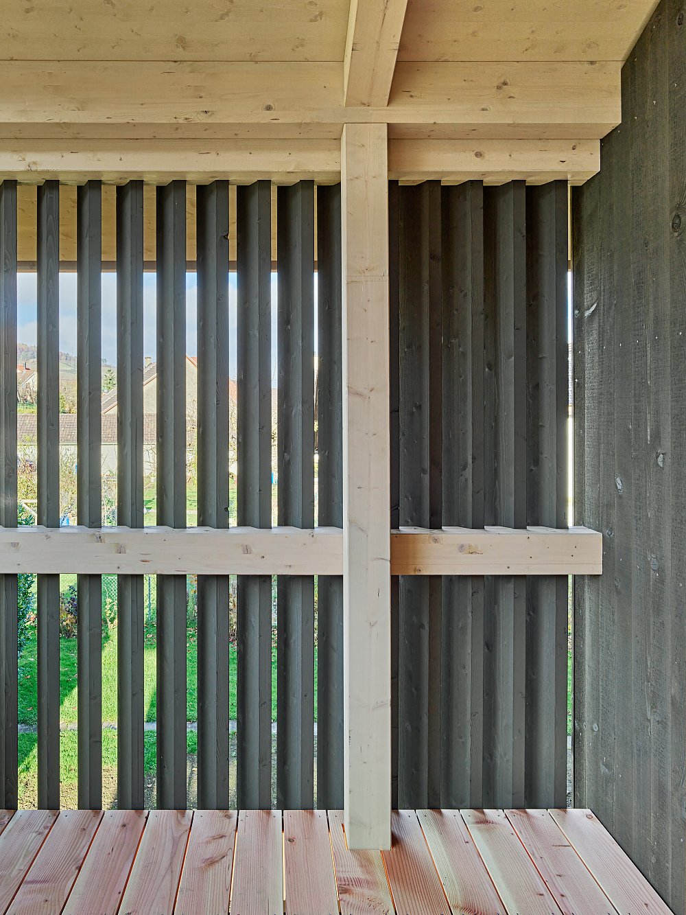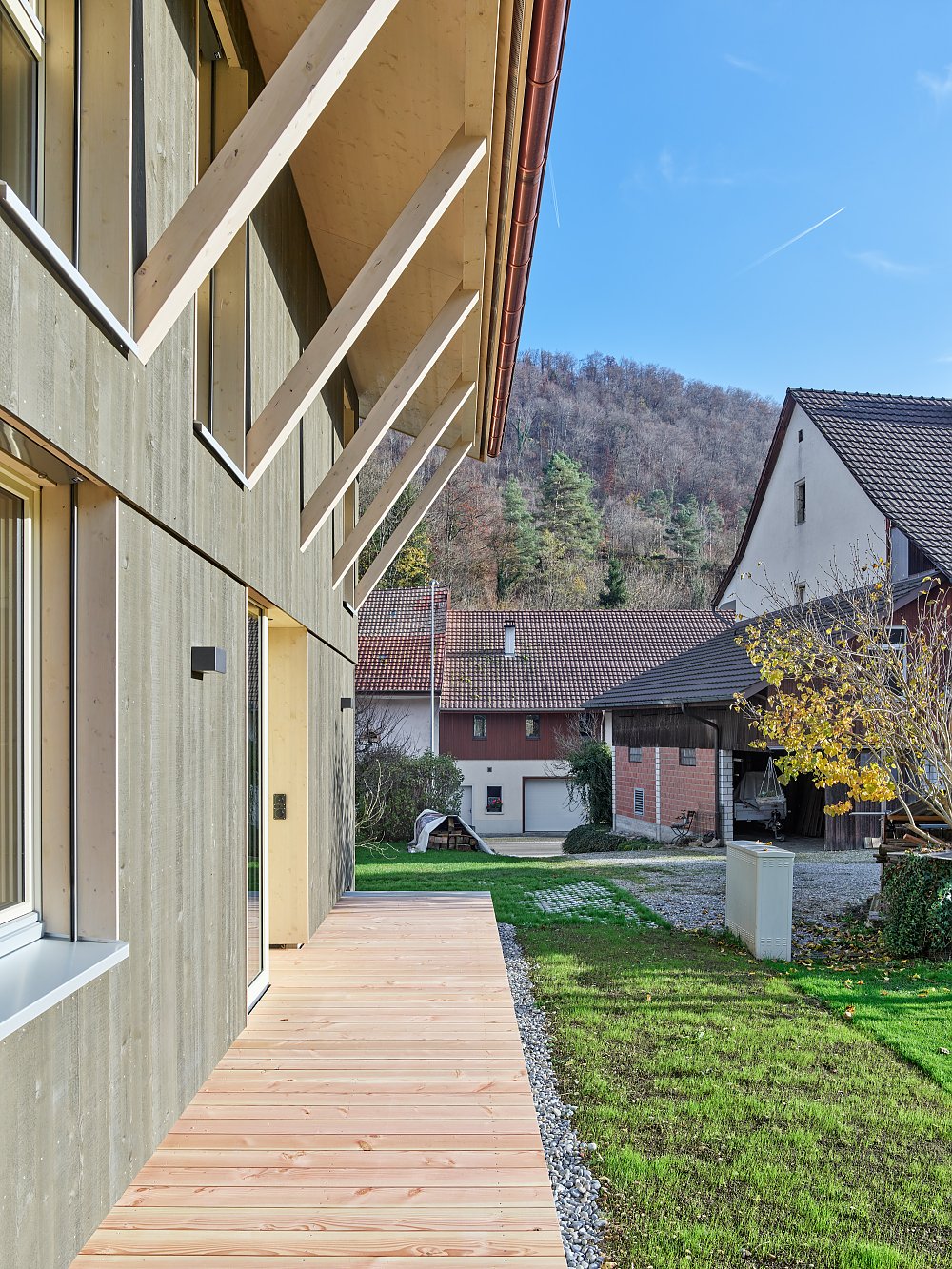 Zur Rückseite öffnete sich das Haus mit einem grosszügigen Aussenbereich, der durch das giebelseitige Vordach und den Balkon des Obergeschosses gedeckt wird. Leichte Holzlamellen bieten Schutz und Privatheit, ohne den Aussenraum optisch zu verschliessen.