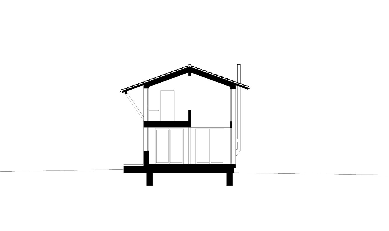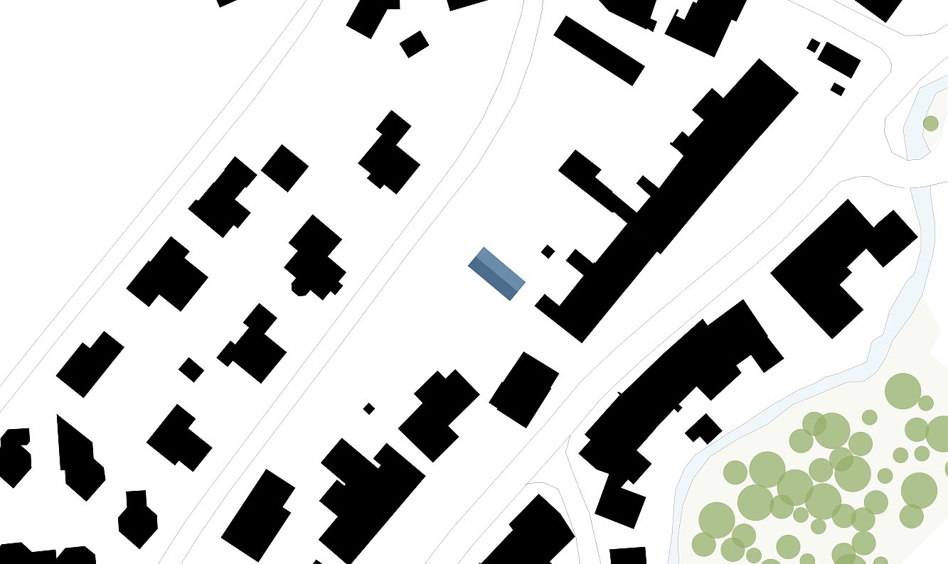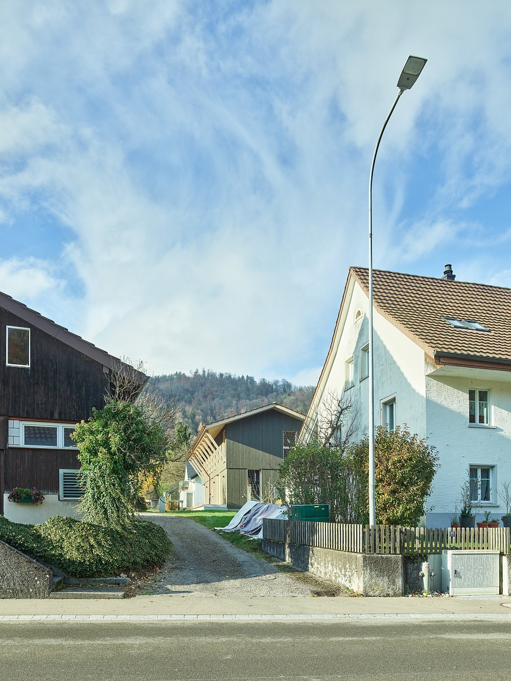 Der Baukörper ist einer typischen Remise, wie sie zuvor hier stand, nachempfunden und orientiert sich selbstverständlich in den ruhigen, rückwärtigen Raum. Ein grosszügiges Vordach bildete die Verbindung zwischen Hauptstrasse und dem hinteren Huttenweg. Getragen von feinen Holzstreben markierte es den seitlichen Eingang und erzeugte eine einladende Passage durchs Grundstück.