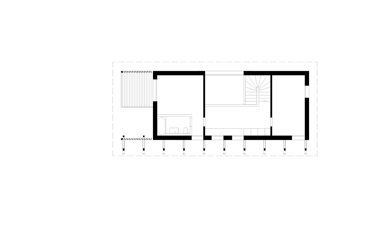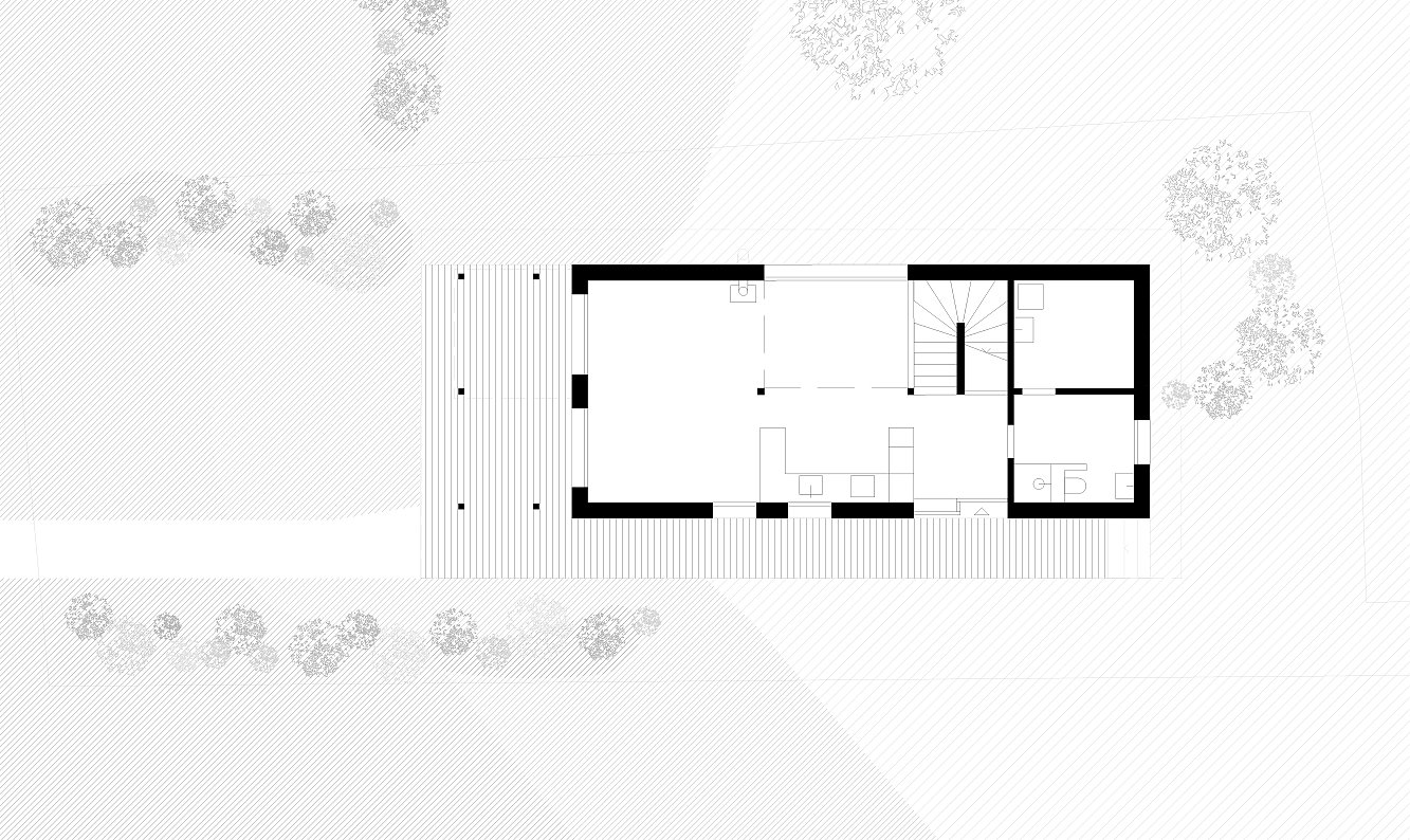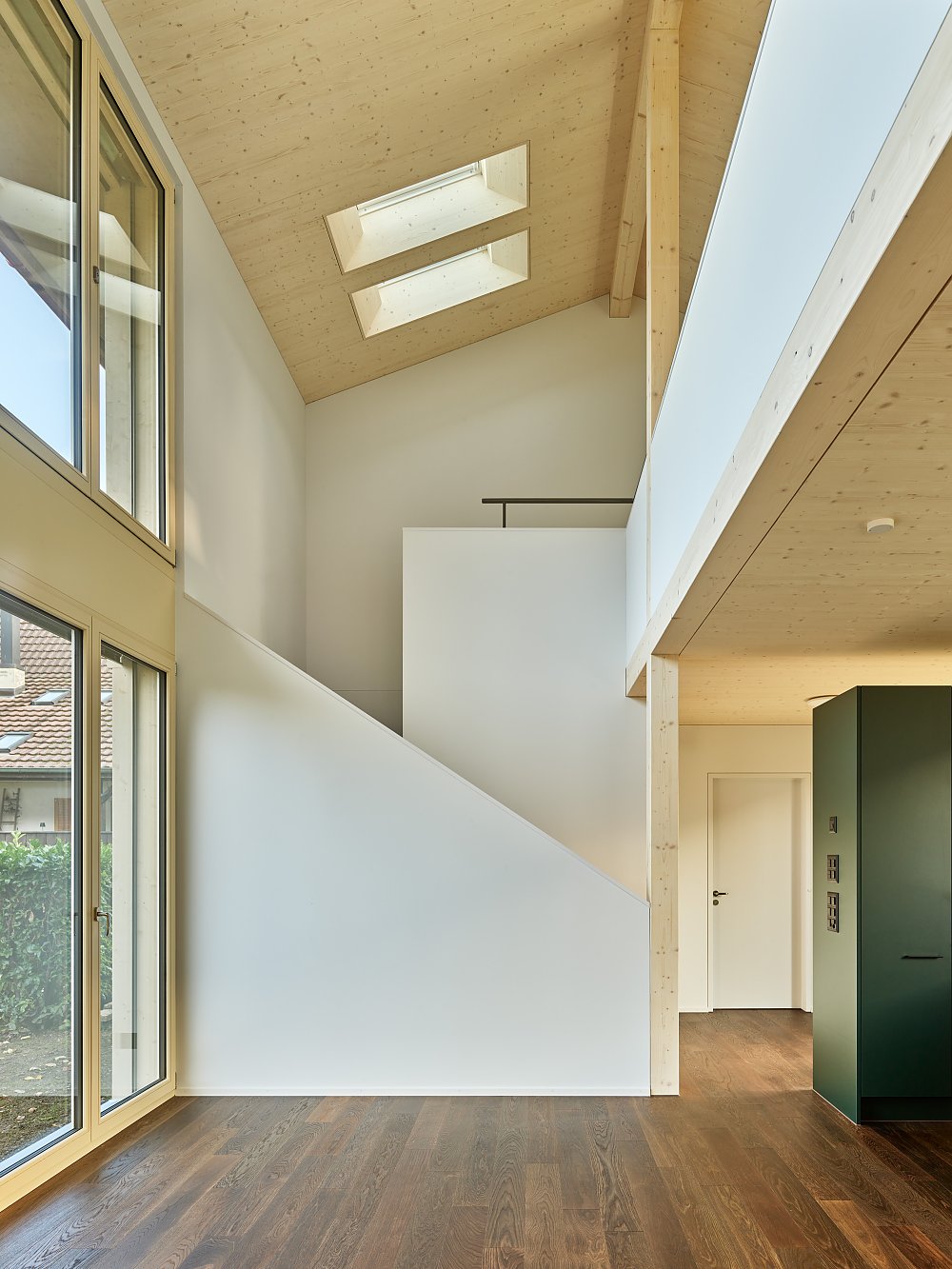 Im Erdgeschoss liegt der offene Wohn- und Essbereich mit einer grosszügigen Küche und einem doppelgeschossigen Raum, der die Treppe ins Obergeschoss inszeniert. Oben befinden sich zwei Zimmer an den Stirnseiten sowie ein zweites Bad. Dank des durchdachten Grundrisses kann im Luftraum später ein vollwertigen Zimmer eingebaut werden – das Haus für die Elterngeneration lässt sich so flexibel in ein grosszügiges Familienhaus transformieren. Das Gebäude wächst dadurch mit den Bedürfnissen seiner Bewohnenden mit.